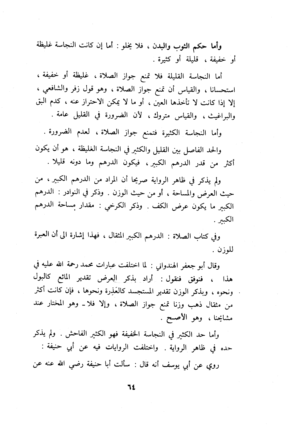 وَقَالَ أَبُو جَعْفَر الهنداوي لما اخْتلفت عِبَارَات مُحَمَّد رَحْمَة الله عَلَيْهِ فِي هَذَا فنوفق فَنَقُول أَرَادَ بِذكر الْعرض تَقْدِير الْمَائِع كالبول وَنَحْوه وبذكر الْوَزْن تَقْدِير المستجسد كالعذرة وَنَحْوهَا فَإِن كَانَت أَكثر من مِثَال ذهب وزنا تمنع جَوَاز الصَّلَاة وَإِلَّا فَلَا وَهُوَ الْمُخْتَار عِنْد مَشَايِخنَا وَهُوَ الْأَصَح