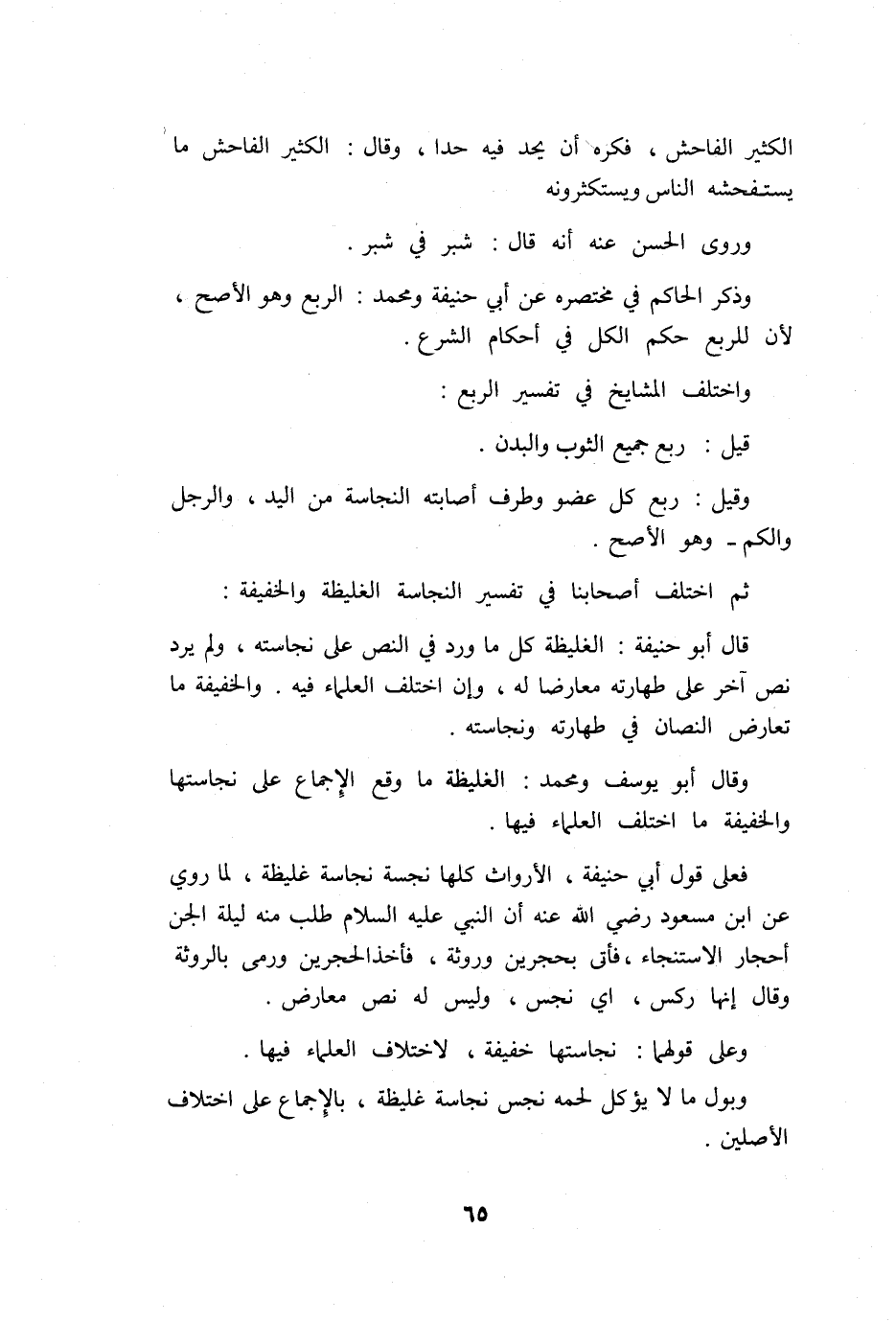 ثمَّ اخْتلف أَصْحَابنَا فِي تَفْسِير النَّجَاسَة الغليظة والخفيفة قَالَ أَبُو حنيفَة الغليظة كل مَا ورد فِي النَّص على نَجَاسَته وَلم يرد نَص آخر على طَهَارَته مُعَارضا لَهُ وَإِن اخْتلف الْعلمَاء فِيهِ