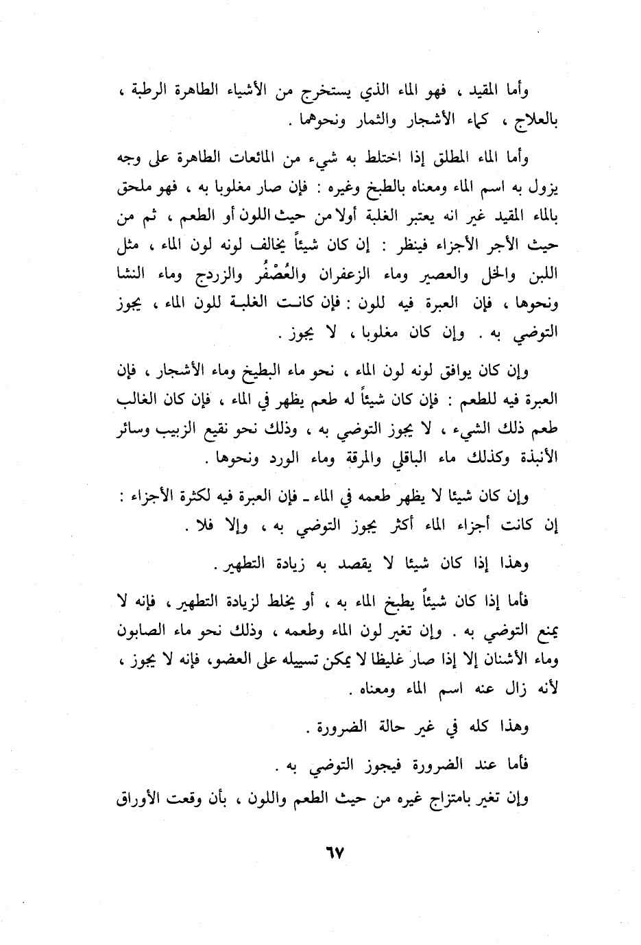 وَإِن كَانَ يُوَافق لَونه لون المَاء نَحْو مَاء الْبِطِّيخ وَمَاء الْأَشْجَار فَإِن الْعبْرَة فِيهِ للطعم فَإِن كَانَ شَيْئا لَهُ طعم يظْهر فِي المَاء فَإِن كَانَ الْغَالِب طعم ذَلِك الشَّيْء لَا يجوز التوضي بِهِ وَذَلِكَ نَحْو نَقِيع الزَّبِيب وَسَائِر الأنبذة وَكَذَلِكَ مَاء الباقلي والمرقة وَمَاء الْورْد وَنَحْوهَا