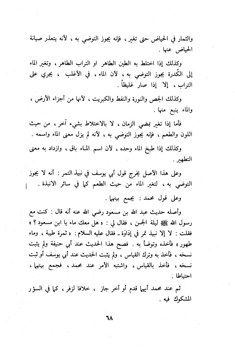 وعَلى هَذَا الأَصْل يخرج قَول أبي يُوسُف فِي نَبِيذ التَّمْر أَنه لَا يجوز التوضي بِهِ لتغير المَاء من حَيْثُ الطّعْم كَمَا فِي سَائِر الأنبذة