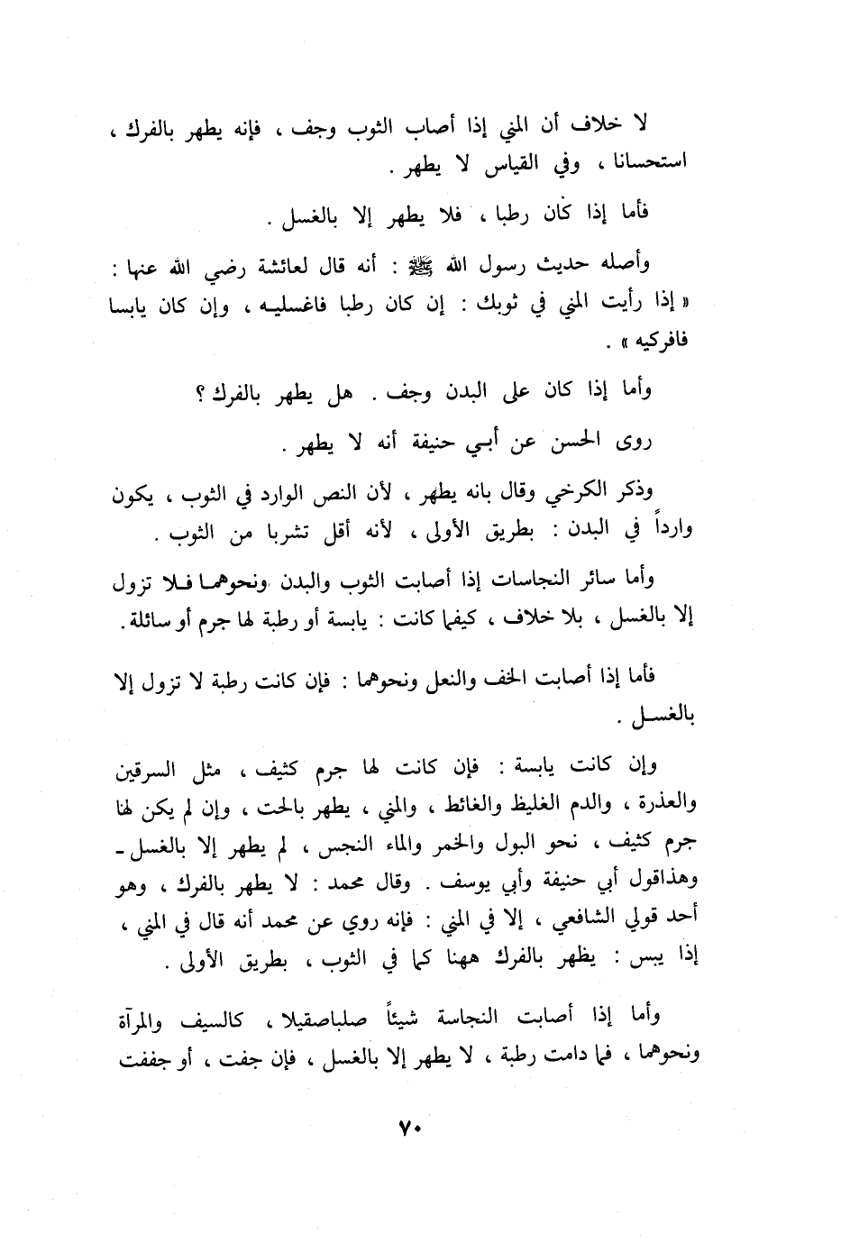 وَقَالَ مُحَمَّد لَا يطهر بالفرك وَهُوَ أحد قولي الشَّافِعِي إِلَّا فِي الْمَنِيّ فَإِنَّهُ رُوِيَ عَن محمدأنه قَالَ فِي الْمَنِيّ إِذا يبس يطهر بالفرك هَهُنَا كَمَا فِي الثَّوْب بطرِيق الأولى