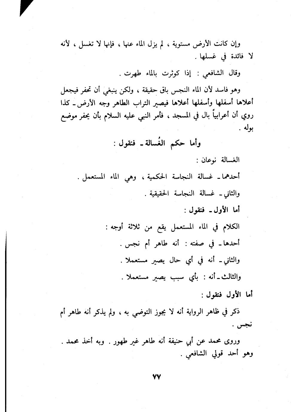 أما الأول فَنَقُول الْكَلَام فِي المَاء الْمُسْتَعْمل يَقع من ثَلَاثَة أوجه أَحدهَا فِي صفته أَنه طَاهِر أم نجس