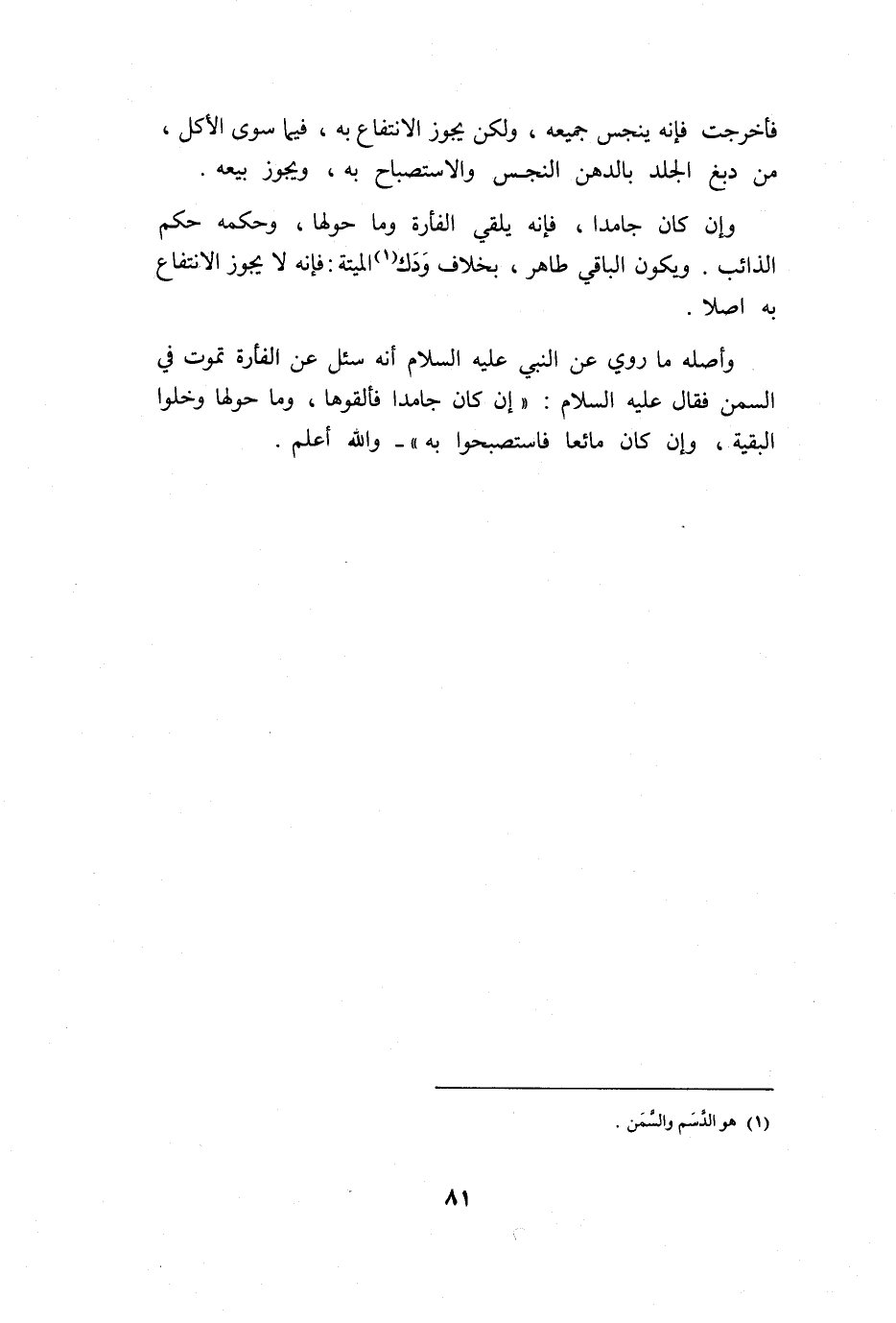 وَأَصله مَا رُوِيَ عَن النَّبِي عَلَيْهِ السَّلَام أَنه سُئِلَ عَن الْفَأْرَة تَمُوت فِي السّمن فَقَالَ عَلَيْهِ السَّلَام إِن كَانَ جَامِدا فألقوها وَمَا حولهَا وخلوا الْبَقِيَّة وَإِن كَانَ مَائِعا فاستصبحوا بِهِ وَالله أعلم