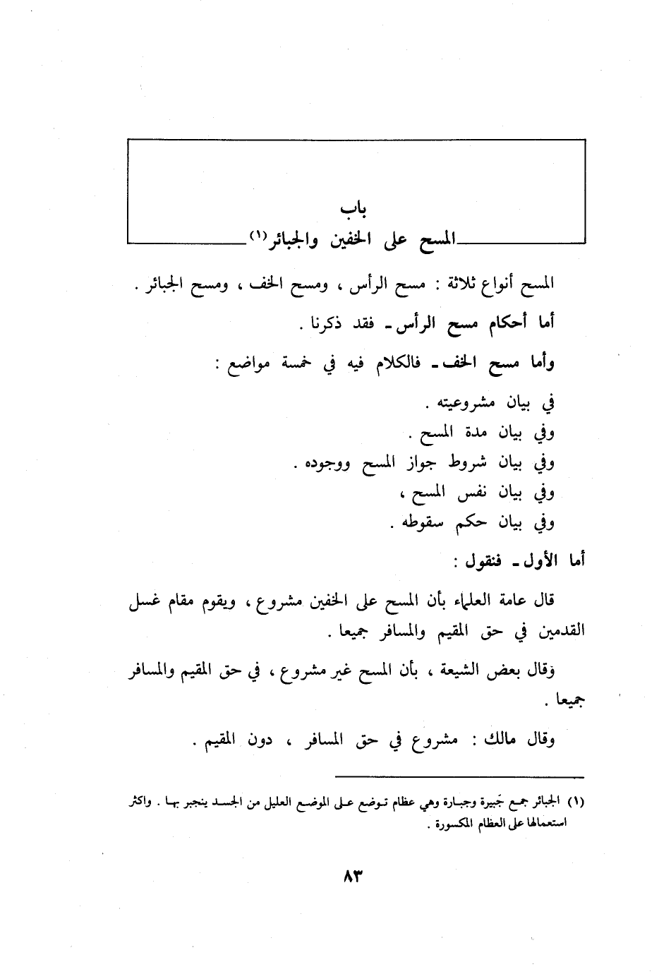 أما الأول فَنَقُول قَالَ عَامَّة الْعلمَاء بِأَن الْمسْح على الْخُفَّيْنِ مَشْرُوع وَيقوم مقَام غسل الْقَدَمَيْنِ فِي حق الْمُقِيم وَالْمُسَافر جَمِيعًا وَقَالَ بعض الشِّيعَة بِأَن الْمسْح غير مَشْرُوع فِي حق الْمُقِيم وَالْمُسَافر جَمِيعًا