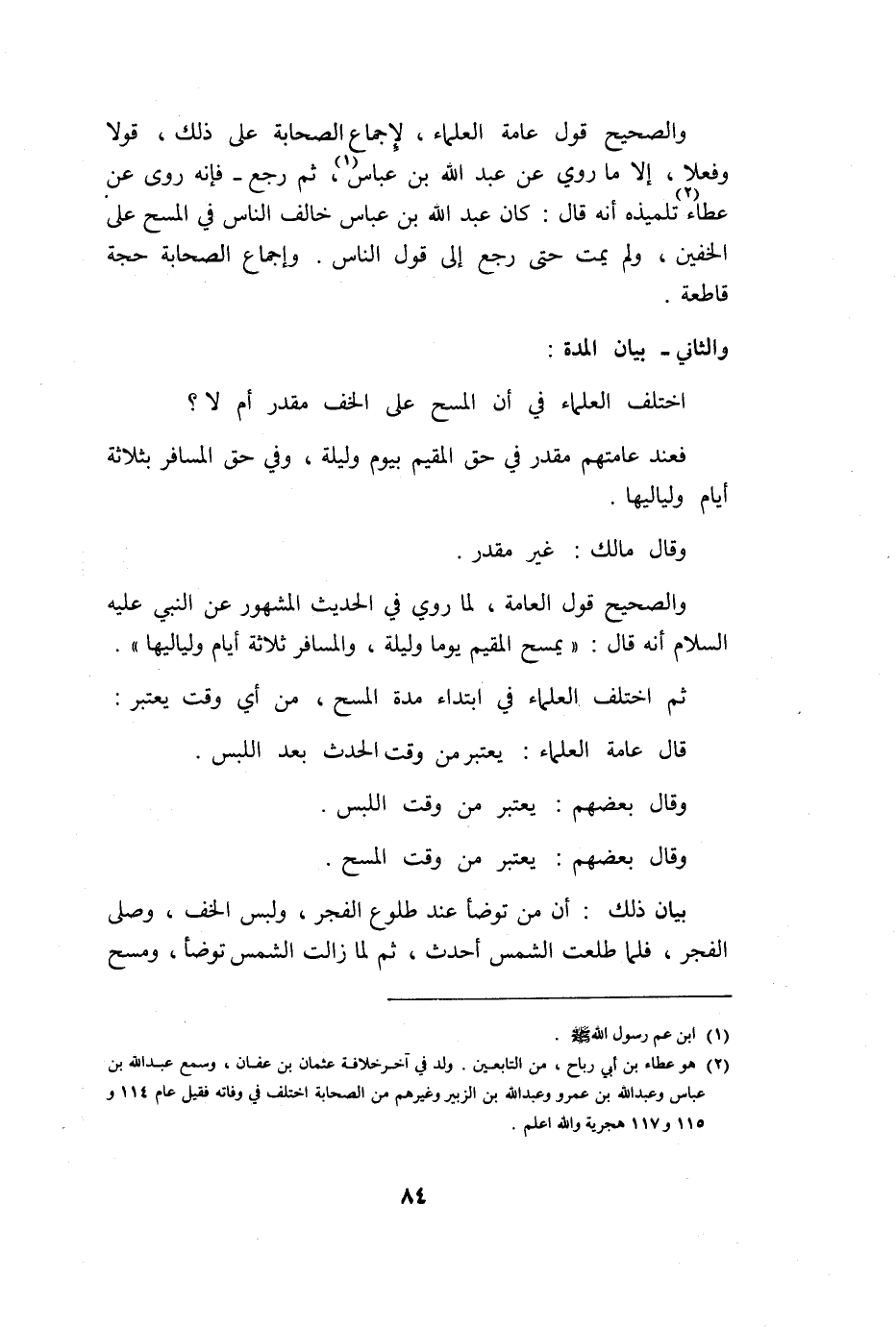 وَالصَّحِيح قَول عَامَّة الْعلمَاء لإِجْمَاع الصَّحَابَة على ذَلِك قولا وفعلا إِلَّا مَا رُوِيَ عَن عبد الله بن عَبَّاس ثمَّ رَجَعَ فَإِنَّهُ رُوِيَ عَن عطاءتلميذه أَنه قَالَ كَانَ عبد الله بن عَبَّاس خَالف النَّاس فِي الْمسْح على الْخُفَّيْنِ وَلم يمت حَتَّى رَجَعَ إِلَى قَول النَّاس