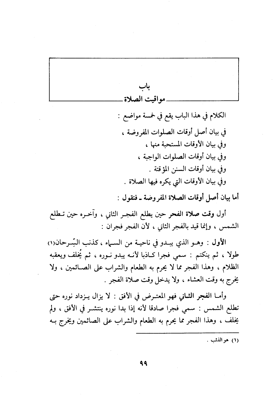الْكَلَام فِي هَذَا الْبَاب يَقع فِي خَمْسَة مَوَاضِع فِي بَيَان أصل أَوْقَات الصَّلَوَات الْمَفْرُوضَة وَفِي بَيَان الْأَوْقَات المستحبة مِنْهَا وَفِي بَيَان أَوْقَات الصَّلَوَات الْوَاجِبَة وَفِي بَيَان أَوْقَات السّنَن المؤقتة وَفِي بَيَان الْأَوْقَات الَّتِي يكره فِيهَا الصَّلَاة
