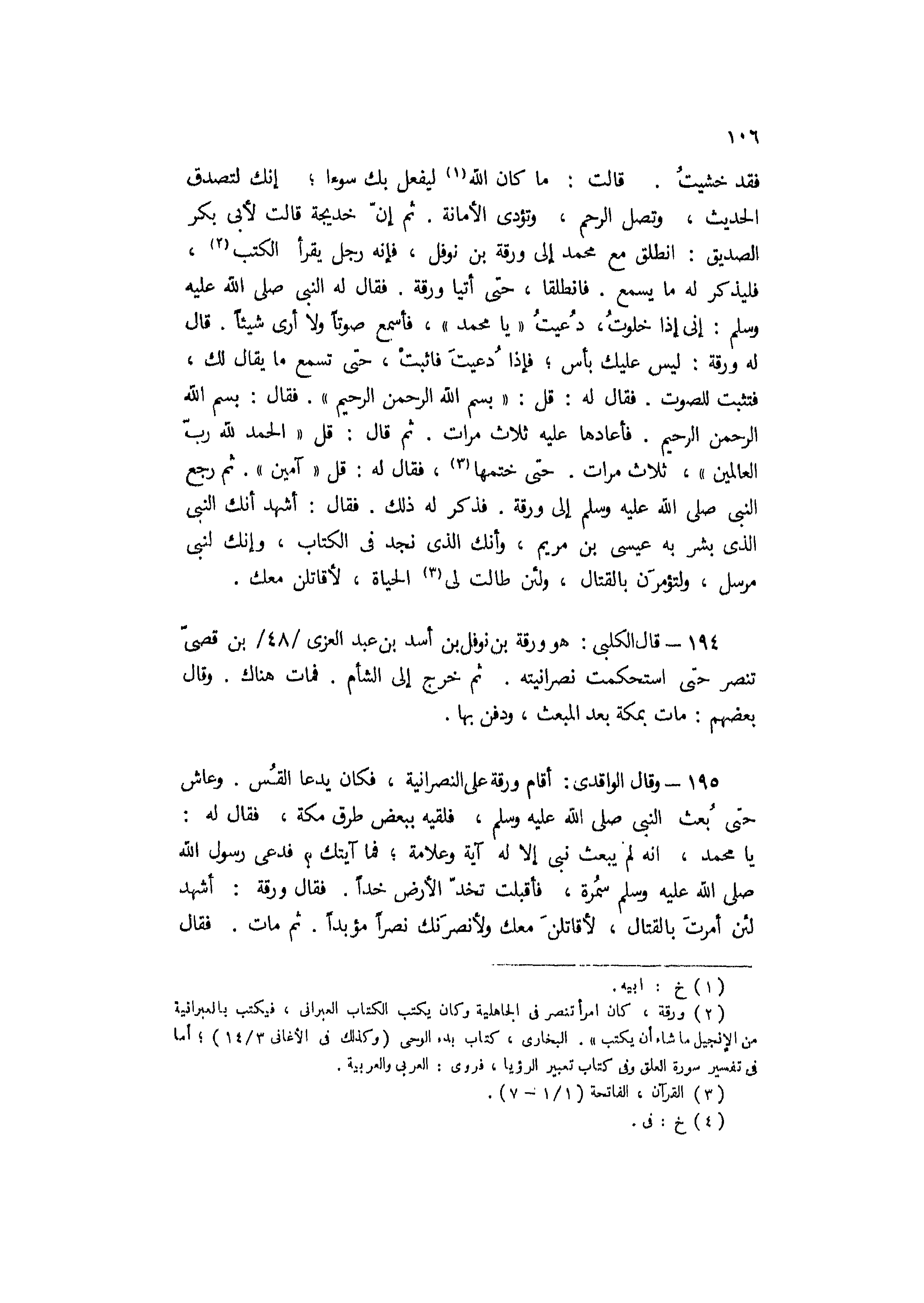 [2] ورقة، كان امرأ تنصر في الجاهلية وكان يكتب الكتاب العبراني، فيكتب بالعبرانية من الإنجيل ما شاء أن يكتب» . البخارى، كتاب بدء الوحى (وكذلك في الأغانى 3/ 14، أما في تفسير سورة العلق وفي كتاب تعبير الرؤيا، فروى: العربي والعربية.
