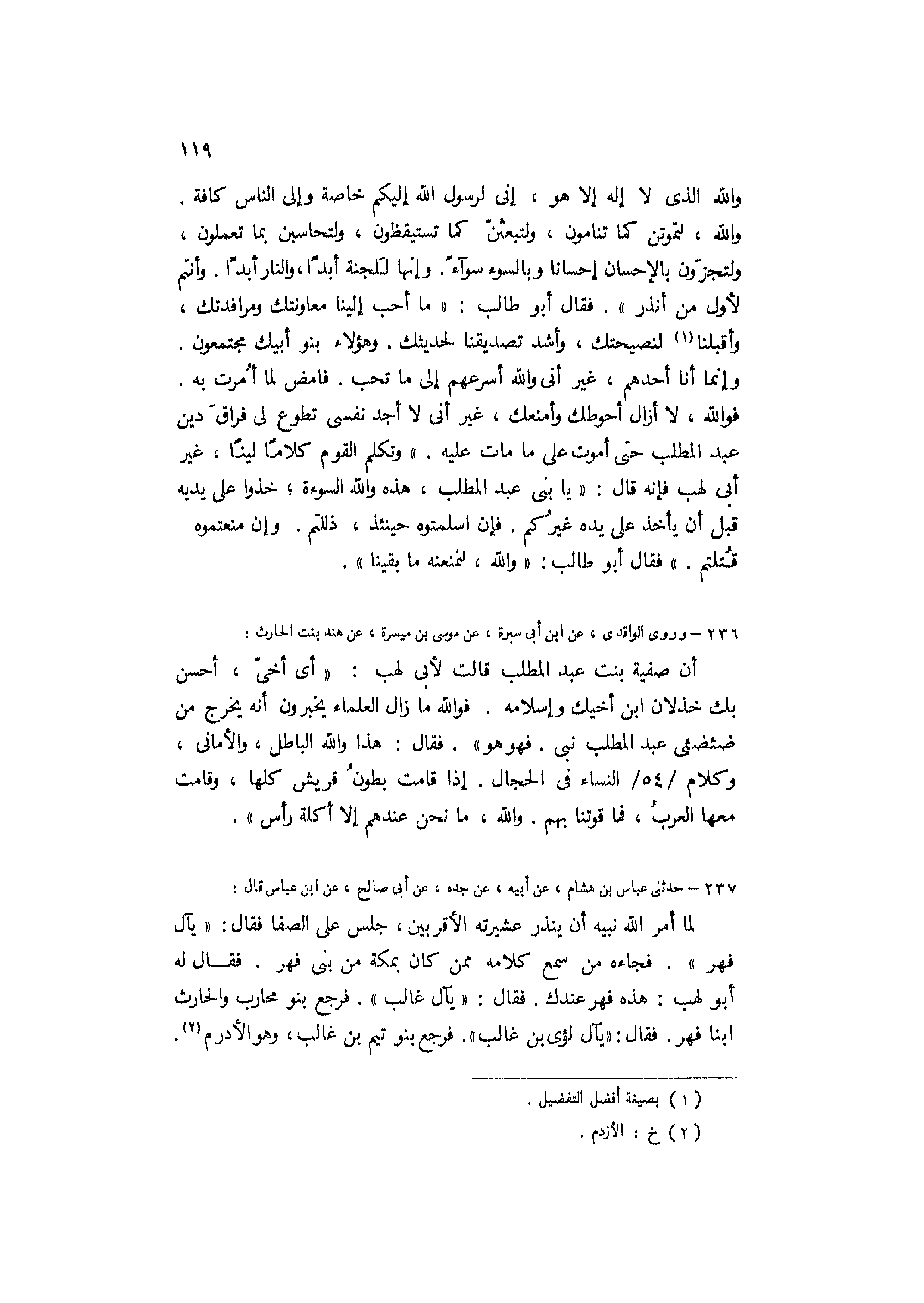 وَاللَّهِ، لَتَمُوتُنَّ كَمَا تَنَامُونَ، وَلَتُبْعَثُنَّ كَمَا تَسْتَيْقِظُونَ، وَلَتُحَاسَبُنَّ بِمَا تَعْمَلُونَ، وَلَتُجْزَوُنَّ بِالإِحْسَانِ إِحْسَانًا وَبِالسُّوءِ سواء. وَإِنَّهَا لَلْجَنَّةُ أَبَدًا، وَالنَّارُ أَبَدًا. وَأَنْتُمْ لأَوَّلُ مَنْ أُنْذِرُ] » . فَقَالَ أَبُو طَالِبٍ: «مَا أَحَبَّ إِلَيْنَا مُعَاوَنَتَكَ وَمُرَافَدَتَكَ، وَأَقْبَلَنَا [1] لِنَصِيحَتِكَ، وَأَشَدَّ تَصْدِيقَنَا لِحَدِيثِكَ. وَهَؤُلاءِ بَنُو أَبِيكَ مُجْتَمِعُونَ.
