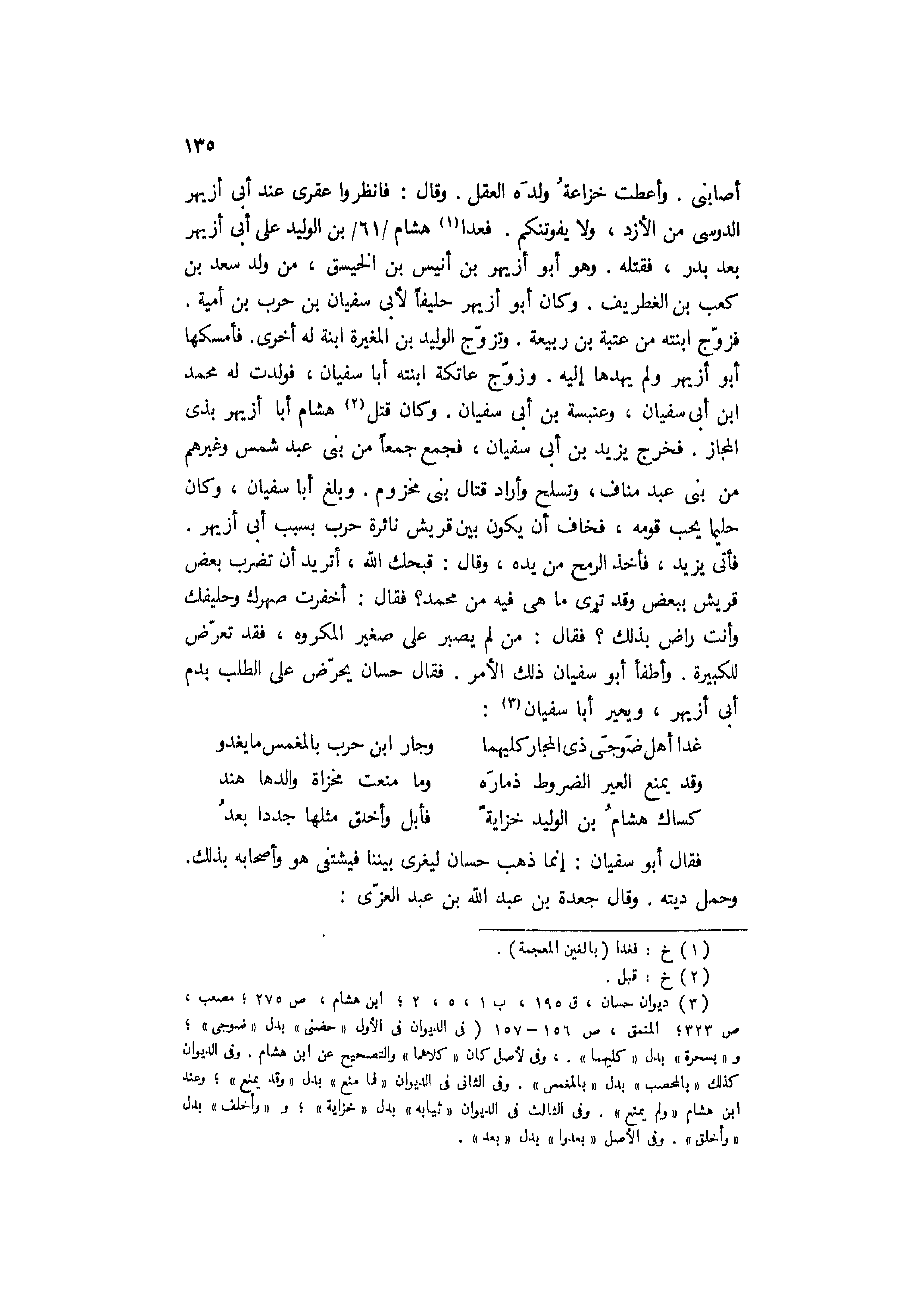 أصابني. وأعطت خزاعة ولده العقل. وقال: فانظروا عقري عند أبي أزيهر الدوسي من الأزد، ولا يفوتنكم. فعدا [1] هشام/ 61/ بن الوليد على أبي أزيهر بعد بدر، فقتله. وهو أبو أزيهر بن أنيس بن الحيسق، من ولد سعد بن كعب بن الغطريف. وكان أبو أزيهر حليفا لأبي سفيان بن حرب بن أمية.