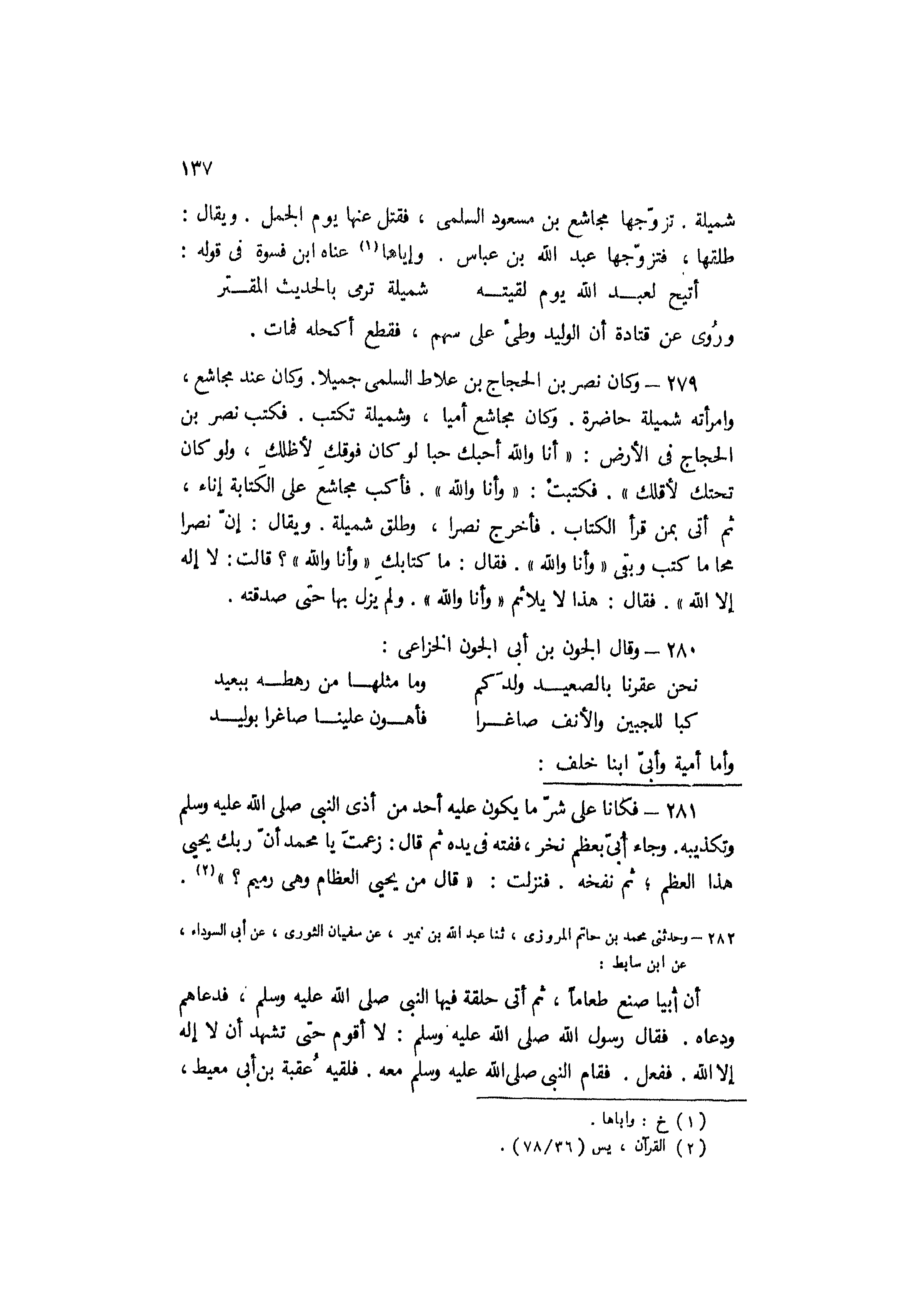 279- وكان نصر بن الحجاج بن علاط السلمي جميلا. وكان عند مجاشع، وامرأته شميلة حاضرة. وكان مجاشع أميا، وشميلة تكتب. فكتب نصر بن الحجاج في الأرض: «أنا والله أحبك حبًا لو كَانَ فوقك لَأظَلَّك، ولو كان تحتك لأقلك» . فكتبت: «وأنا والله» . فأكب مجاشع على الكتابة إناء، ثم أتى بمن قرأ الكتاب. فأخرج نصرا، وطلق شميلة. ويقال: إنّ نصرا محاما كتب وبقي «وأنا والله» . فقال: ما كتابك «وأنا والله» ؟ قالت: لا إله إلا الله» . فقال: هذا لا يلائم «وأنا والله» . ولم يزل بها حتى صدقته.