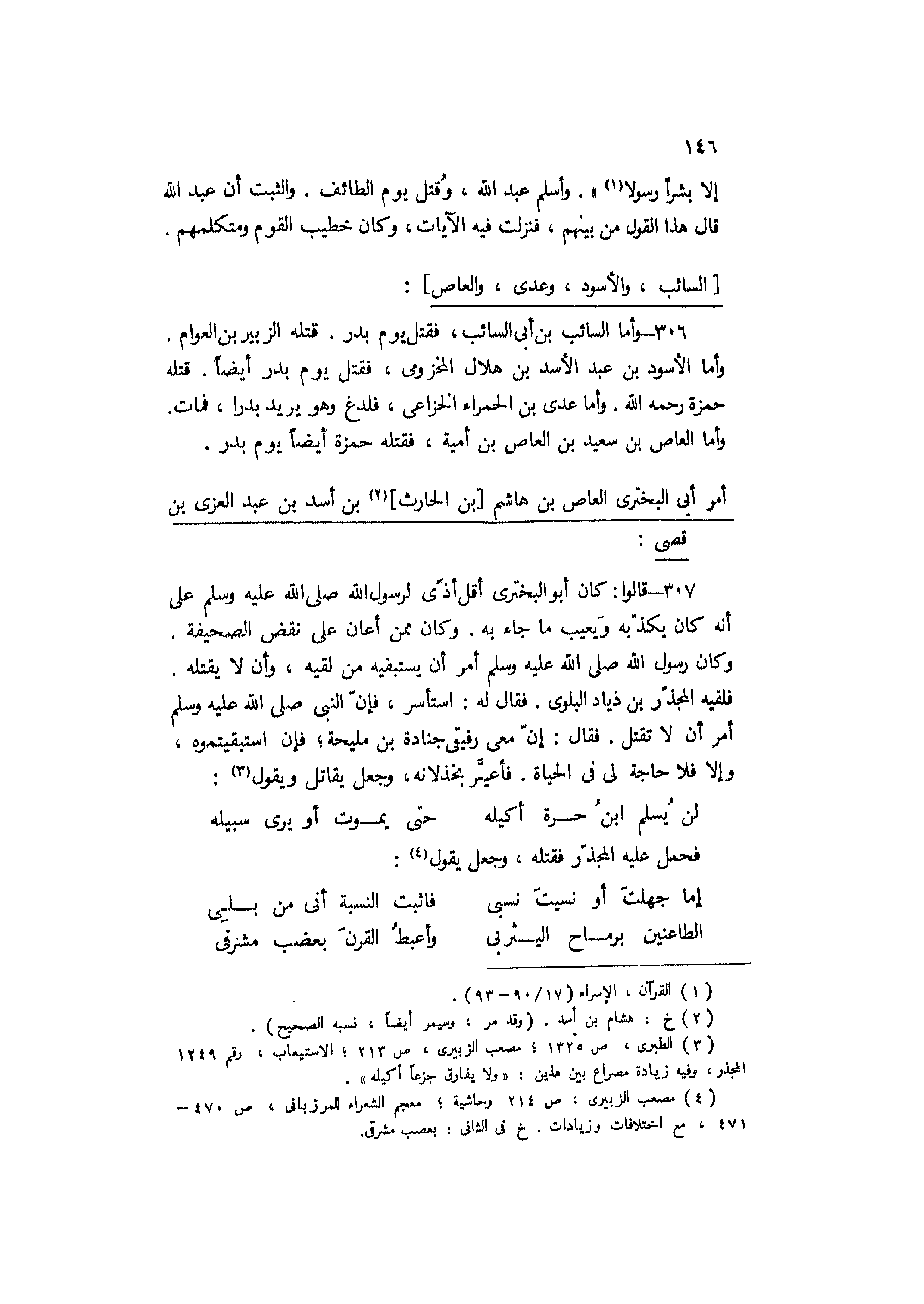 306- وأما السائب بن أبي السائب، فقتل يوم بدر. قتله الزبير بن العوام.