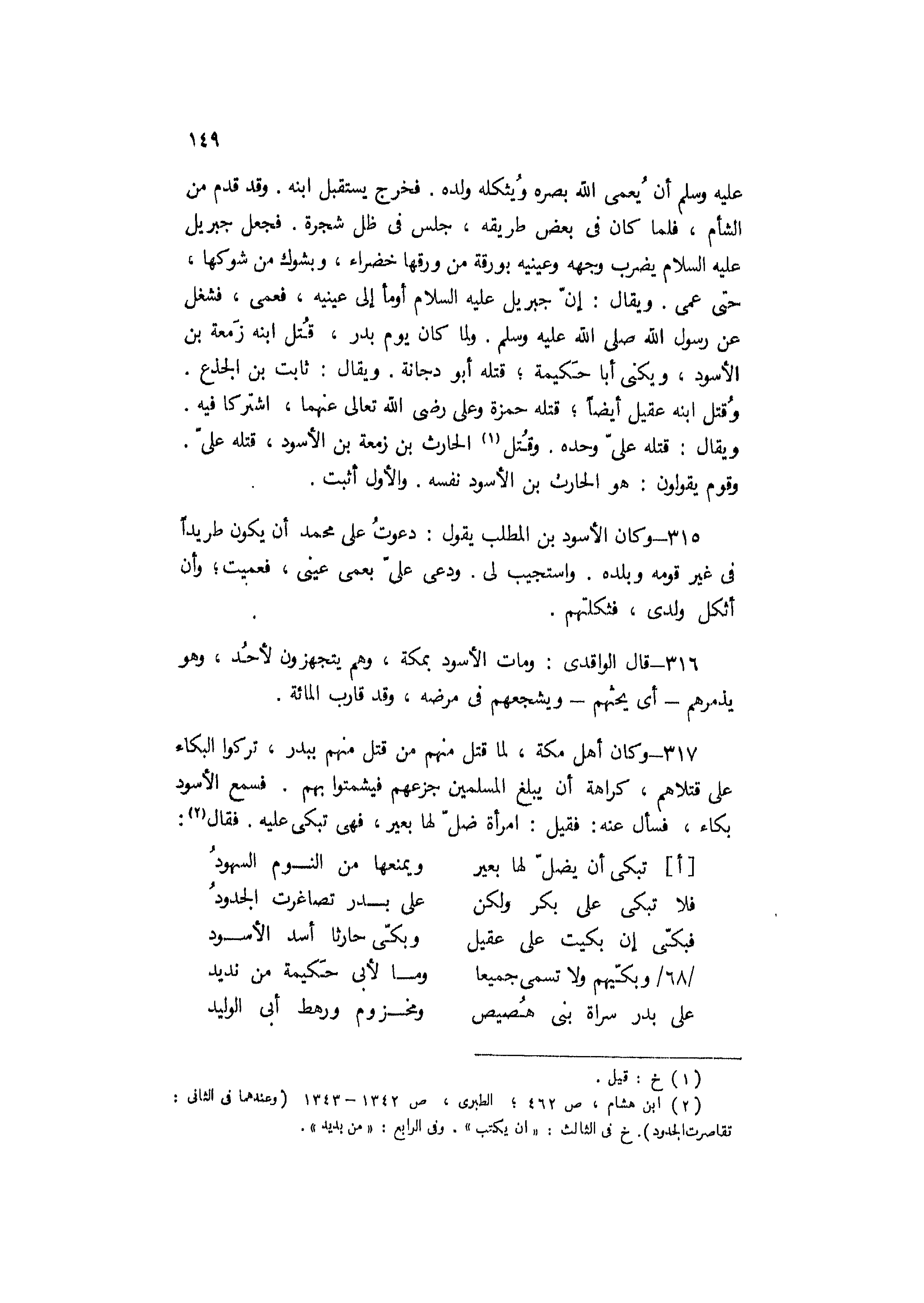 317- وكان أهل مكة، لما قتل منهم من قتل منهم ببدر، تركوا البكاء على قتلاهم، كراهة أن يبلغ المسلمين جزعهم فيشمتوا بهم. فسمع الأسود بكاء، فسأل عنه: فقيل: امرأة ضل لها بعير، فهى تبكى عليه. فقال [2] :