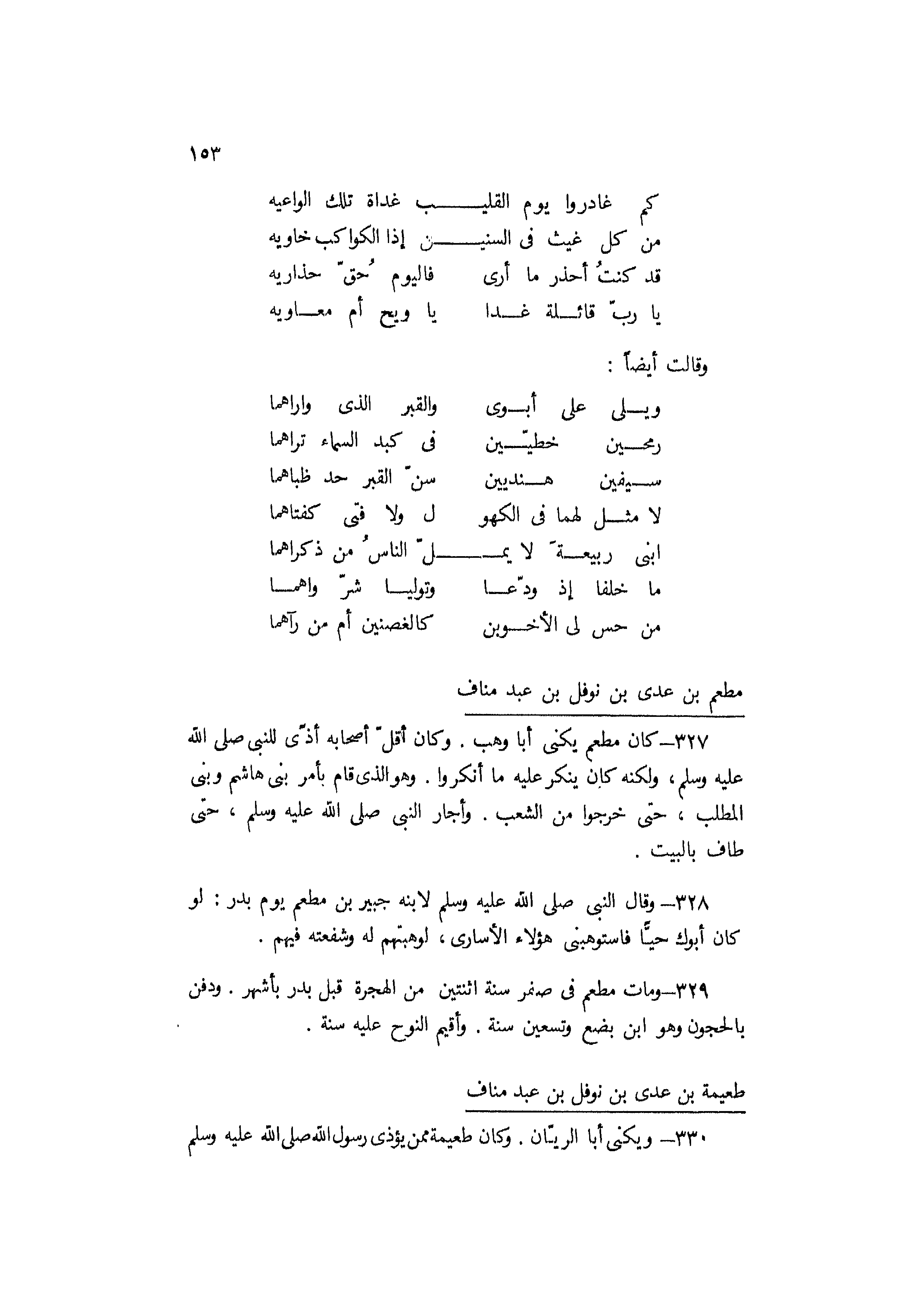 327- كان مطعم يكنى أبا وهب. وكان أقل أصحابه أذى للنبي صلى اللَّه عليه وسلم، ولكنه كان ينكر عليه ما أنكروا. وهو الذي قام بأمر بني هاشم وبني المطلب، حتى خرجوا من الشعب. وأجار النبي صلى اللَّه عليه وسلم، حتى طاف بالبيت.