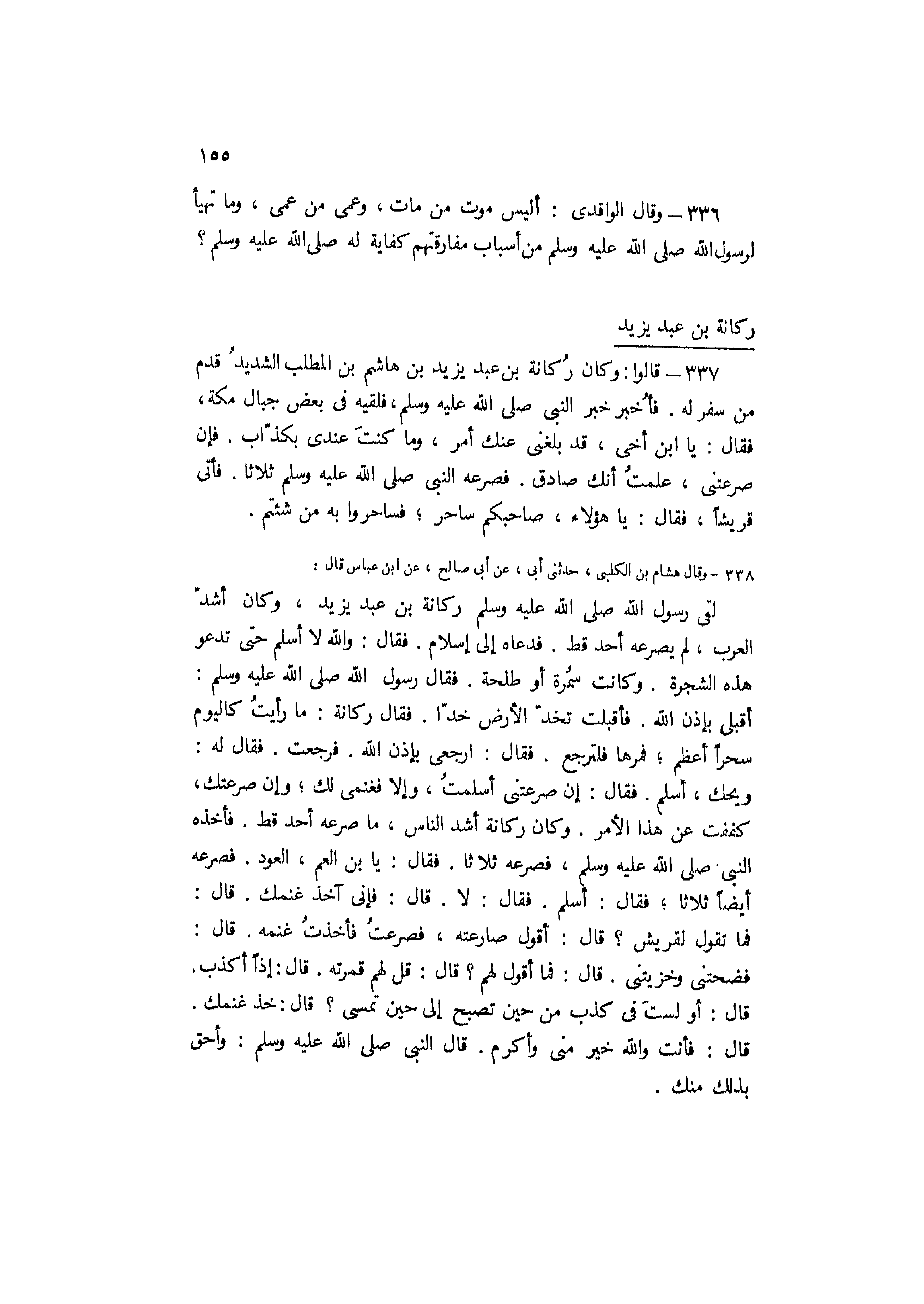 337- قالوا: وكان ركانة بْن عبد يزيد بْن هاشم بْن المطلب الشديد قدم من سفر له. فَأُخْبِرَ خَبَرَ النَّبِيِّ صَلَّى اللَّه عَلَيْهِ وَسَلَّمَ، فلقيه في بعض جبال مكة، فقال: يا ابن أخي، قد بلغني عنك أمر، وما كنت عندي بكذاب. فإن صرعتني، علمت أنك صادق. فصرعه النبي صلى اللَّه عليه وسلم ثلاثا. فأتى قريشا، فقال: يا هؤلاء، صاحبكم ساحر، فساحروا به من شئتم.