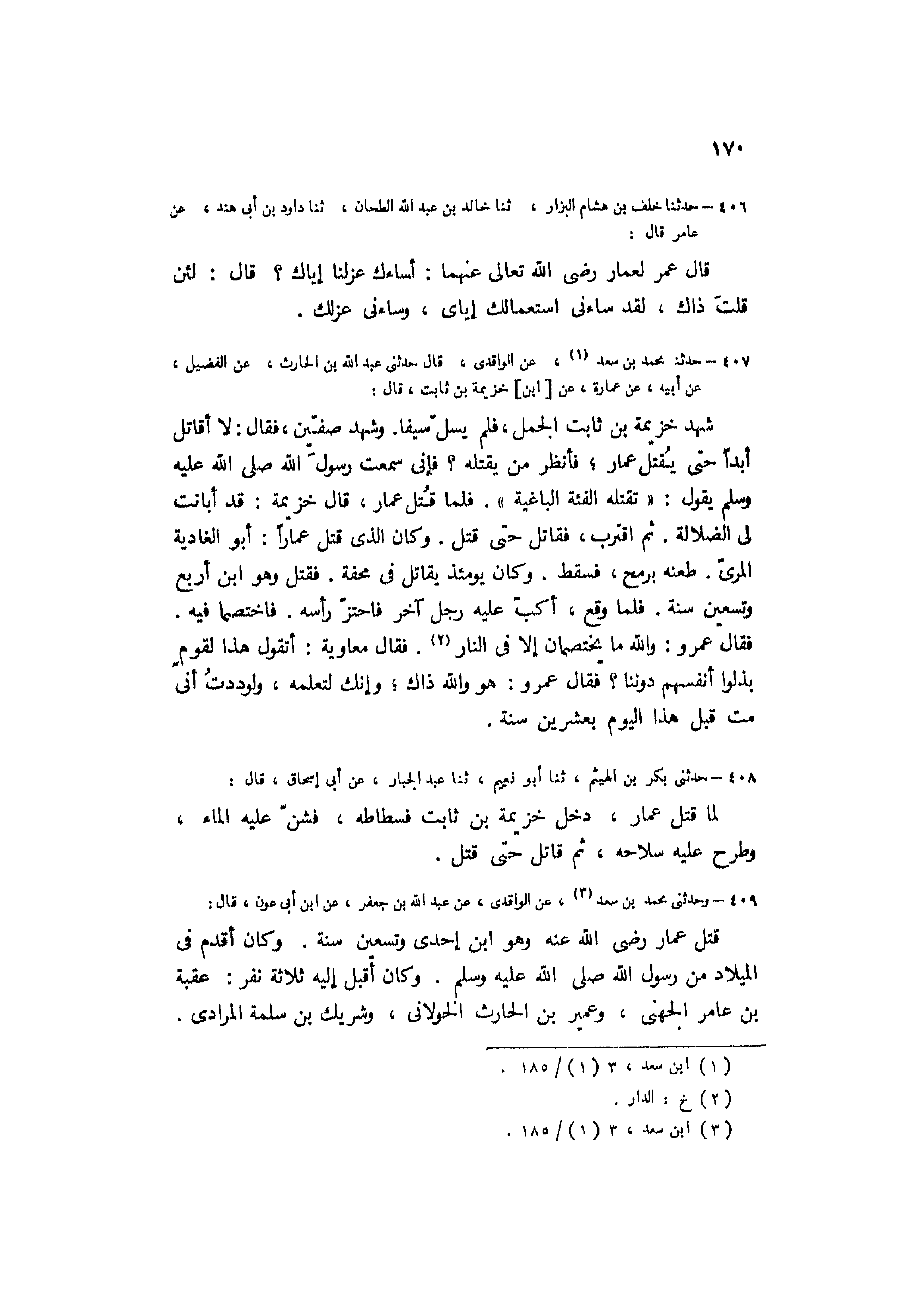 407- حَدَّثَنَا مُحَمَّدُ بْنُ سَعْدٍ [1] ، عَنِ الْوَاقِدِيِّ، قَالَ حَدَّثَنِي عَبْدُ اللَّهِ بْنُ الْحَارِثِ، عَنِ الْفُضَيْلِ، عن أبيه، عن عمارة، عن (ابن) خُزَيْمَةَ بْنِ ثَابِتٍ، قَالَ: