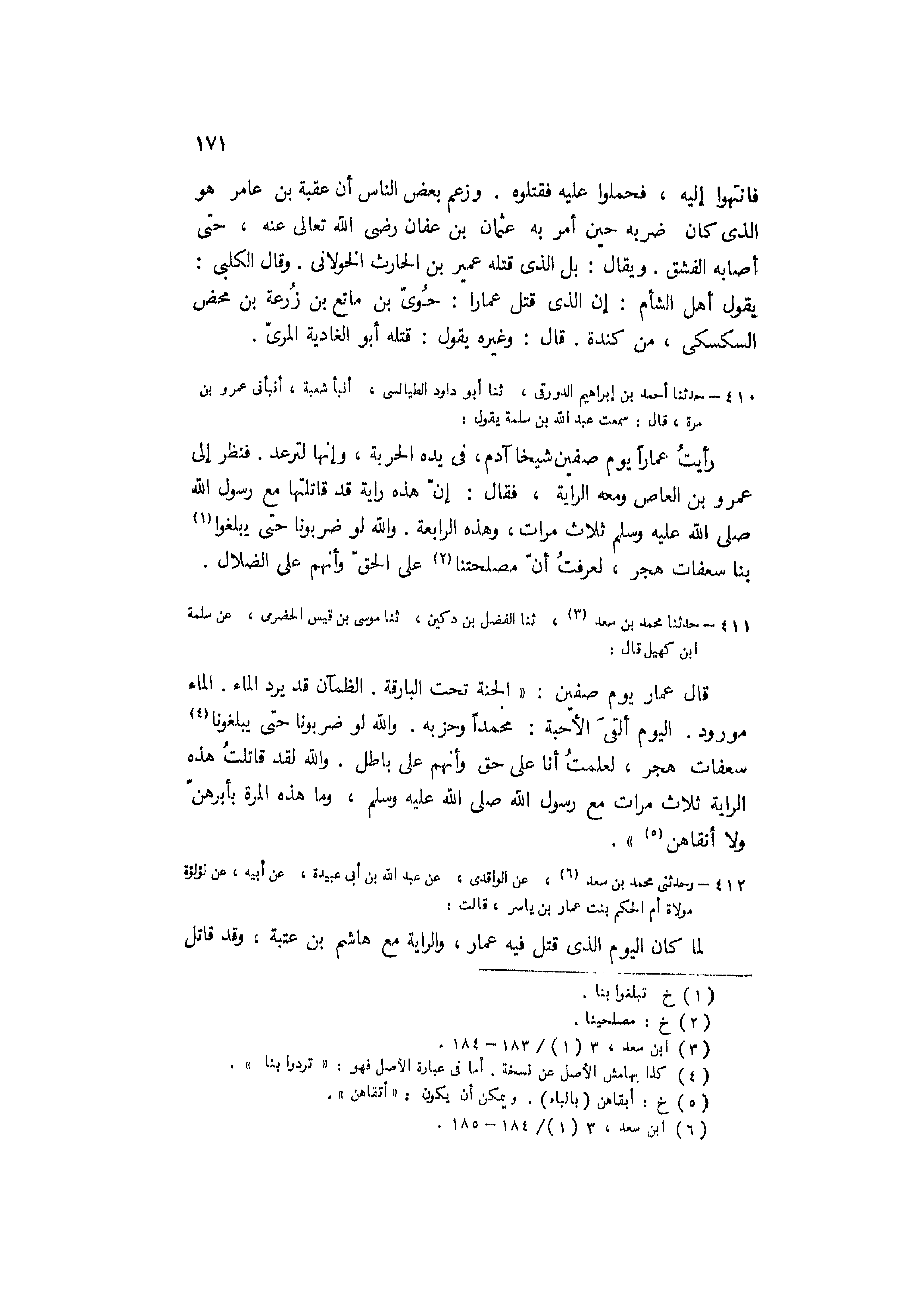 رَأَيْتُ عَمَّارًا يَوْمَ صِفِّينَ شَيْخًا آدَمَ، فِي يَدِهِ الْحَرْبَةُ، وَإِنَّهَا لَتَرْعَدُ. فَنَظَرَ إِلَى عَمْرِو بْنِ الْعَاصِ وَمَعَهُ الرَّايَةُ، فَقَالَ: إِنَّ هَذِهِ رَايَةٌ قَدْ قَاتَلْتُهَا مع رَسُول اللَّهِ صَلَّى اللَّهُ عَلَيْهِ وَسَلَّمَ ثَلاثَ مَرَّاتٍ، وَهَذِهِ الرَّابِعَةُ. وَاللَّهِ لَوْ ضَرَبُونَا حَتَّى يَبْلُغُوا [1] بِنَا سَعَفَاتِ هَجَرَ، لَعَرَفْتُ أَنَّ مصلحتنا [2] عَلَى الْحَقِّ وَأَنَّهُمْ عَلَى الضَّلالِ.