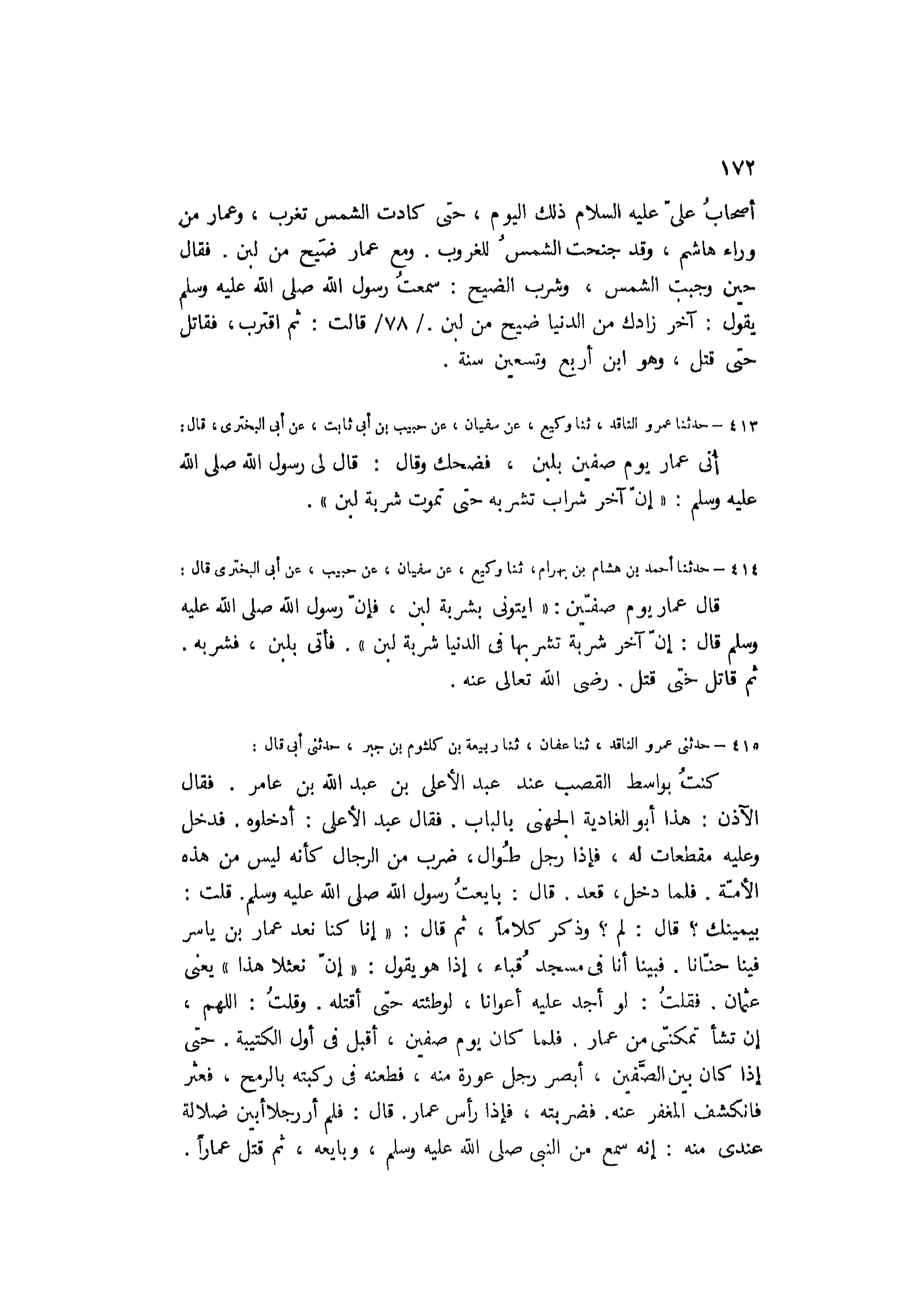 413- حَدَّثَنَا عَمْرٌو النَّاقِدُ، ثنا وَكِيعٌ، عَنْ سُفْيَانَ، عَنْ حَبِيبِ بْنِ أَبِي ثَابِتٍ، عَنْ أَبِي الْبَخْتَرِيِّ، قَالَ: أَتَى عَمَّارٌ يَوْمَ صِفِّينَ بِلَبَنٍ، فَضَحِكَ وَقَالَ: [قَالَ لِي رَسُولُ اللَّهِ صَلَّى اللَّهُ عَلَيْهِ وَسَلَّمَ: «إِنَّ آخِرَ شَرَابٍ تَشْرَبُهُ حَتَّى تَمُوتَ شَرْبَةُ لَبَنٍ] » .