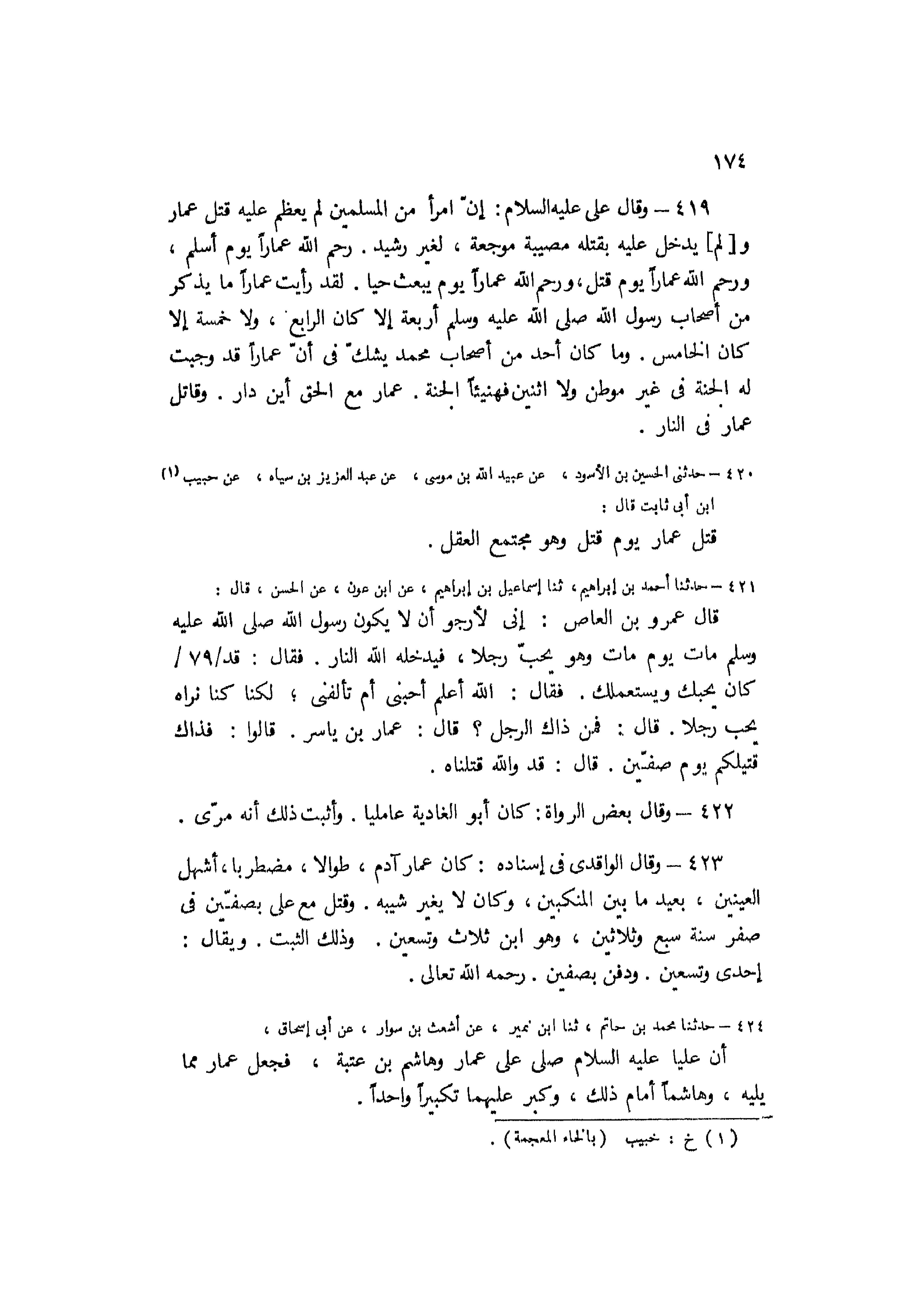 419-[وقال على عليه السلام: إنّ امرأ من المسلمين لم يعظم عليه قتل عمار و (لم) يدخل عليه بقتله مصيبة موجعة، لغير رشيد. رحم الله عمارا يوم أسلم، ورحم الله عمارا يوم قتل، ورحم الله عمارا يوم يبعث حيا. لقد رأيت عمارا ما يذكر مِنْ أَصْحَابِ رَسُولِ اللَّهِ صَلَّى اللَّهُ عَلَيْهِ وسلم أربعة إلا كان الرابع، ولا خمسة إلا كان الخامس. وما كان أحد من أصحاب محمد يشك في أن عمارا قد وجبت له الجنة في غير موطن ولا اثنين فهنيئا الجنة. عمار مع الحق أين دار. وقاتل عمار في النار] .