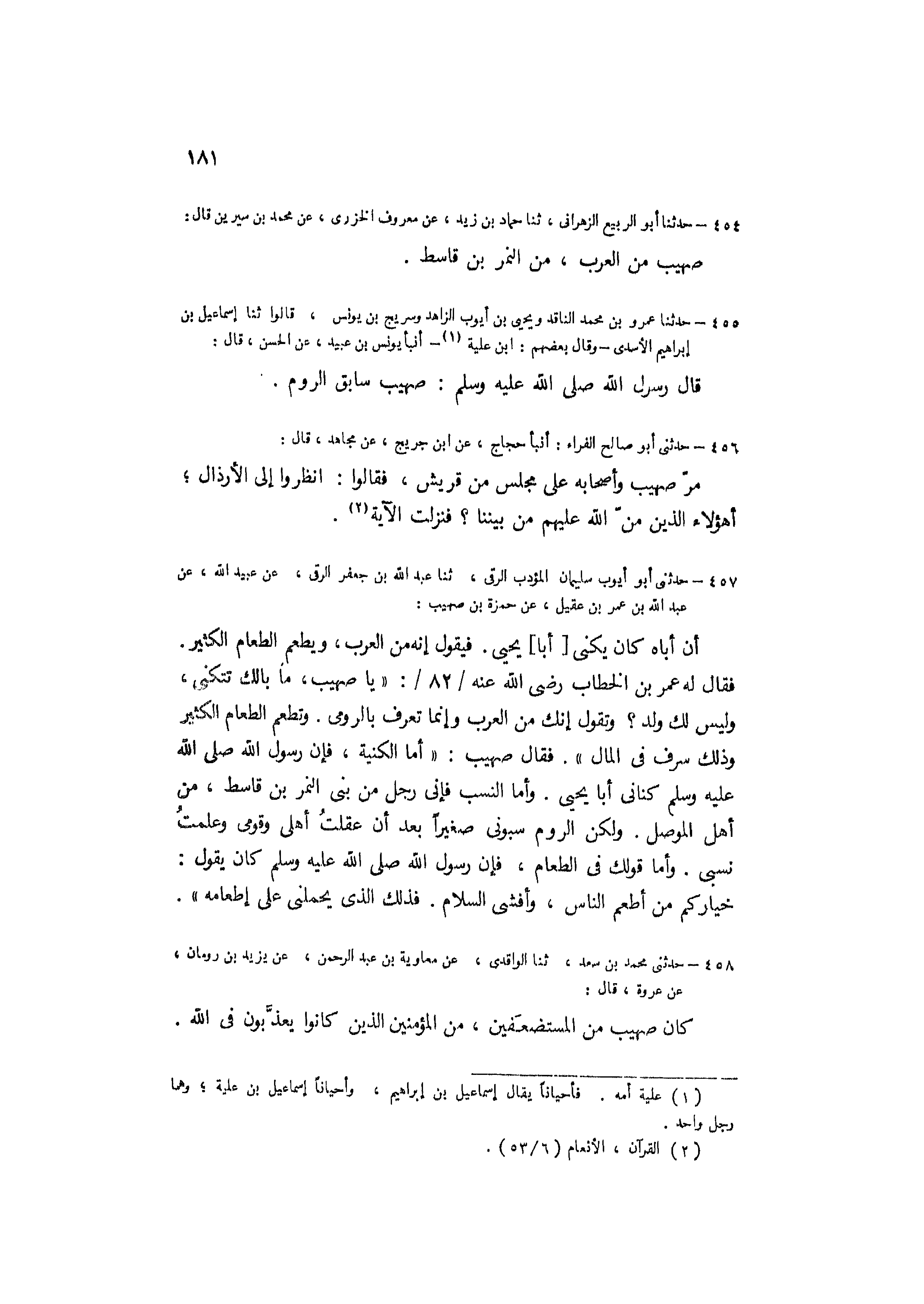 فَقَالَ لَهُ عُمَرُ بْنُ الْخَطَّابِ رَضِيَ اللَّه عَنْهُ/ 82/ «يَا صُهَيْبُ، مَا بَالُكَ تَتَكَنَّى، وَلَيْسَ لَكَ وَلَدٌ؟ وَتَقُولُ إِنَّكَ مِنَ الْعَرَبِ وَإِنَّمَا تُعْرَفُ بِالرُّومِيِّ. وَتُطْعِمُ الطَّعَامَ الْكَثِيرَ وَذَلِكَ سَرَفٌ فِي الْمَالِ» . فَقَالَ صُهَيْبٌ: «أَمَّا الْكُنْيَةُ، فَإِنَّ رَسُولَ اللَّهِ صَلَّى اللَّهُ عَلَيْهِ وَسَلَّمَ كَنَّانِي أَبَا يَحْيَى. وَأَمَّا النَّسَبُ فَإِنِّي رَجُلٌ مِنْ بَنِي النَّمِرِ بْنِ قَاسِطٍ، مِنْ أَهْلِ الْمَوْصِلِ. وَلَكِنَّ الرُّومَ سَبَوْنِي صَغِيرًا بَعْدَ أَنْ عَقِلْتُ أَهْلِي وَقَوْمِي وَعَلِمْتُ نَسَبِي. وَأَمَّا قَوْلُكَ فِي الطَّعَامِ، [فَإِنَّ رَسُولَ اللَّهِ صَلَّى اللَّهُ عَلَيْهِ وَسَلَّمَ كَانَ يَقُولُ: