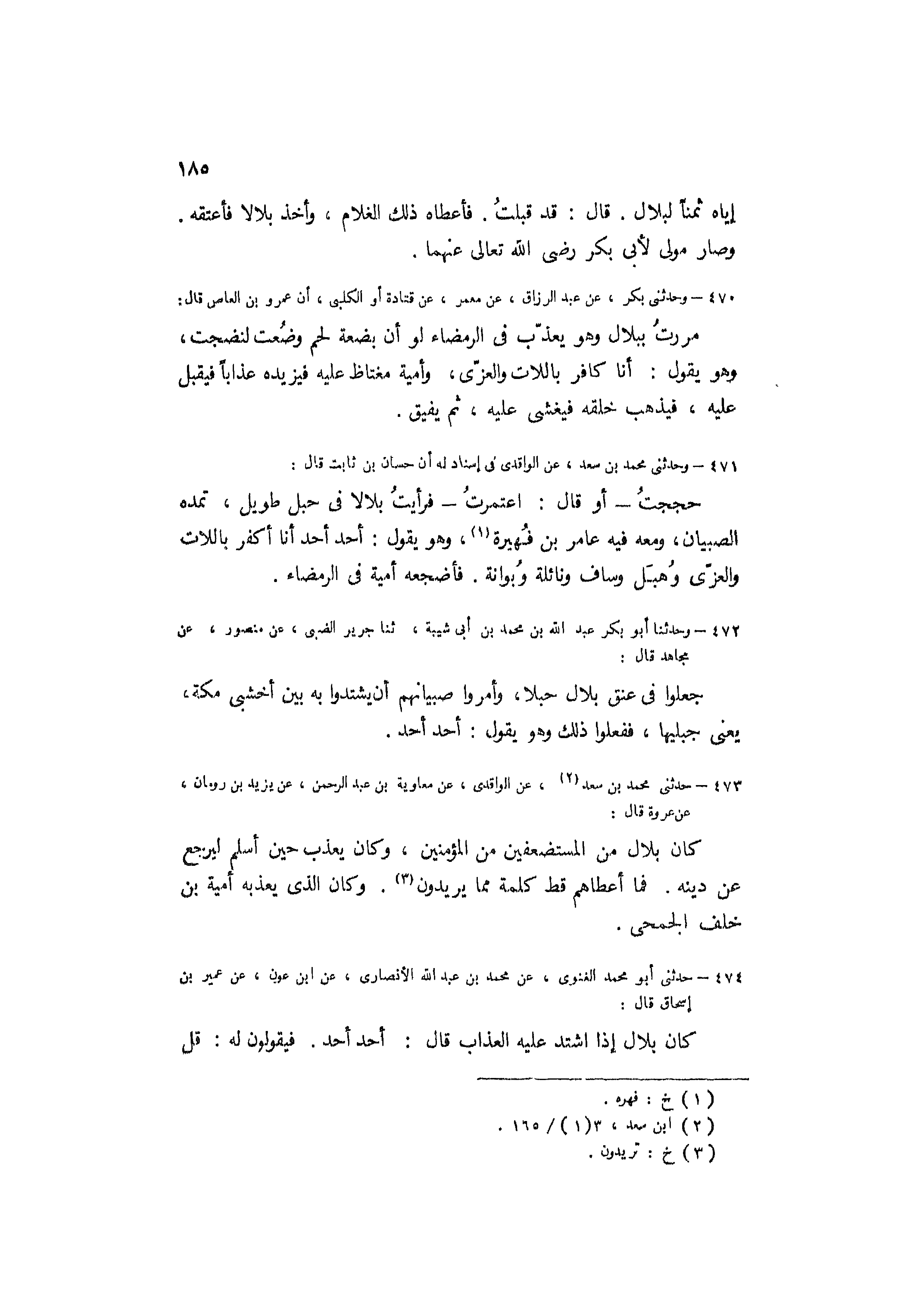 حَجَجْتُ- أَوْ قَالَ: اعْتَمَرْتُ- فَرَأَيْتُ بِلالا فِي حَبْلٍ طَوِيلٍ، تَمُدُّهُ الصِّبْيَانُ، وَمَعَهُ فِيهِ عَامِرُ بْنُ فُهَيْرَةَ [1] ، وَهُوَ يَقُولُ: أَحَدٌ أَحَدٌ أَنَا أَكْفُرُ بِاللاتِ وَالْعُزَّى وَهُبَلَ وَسَافَ وَنَائِلَةَ وَبَوَانَةَ. فأضجعه أمية في الرمضاء.