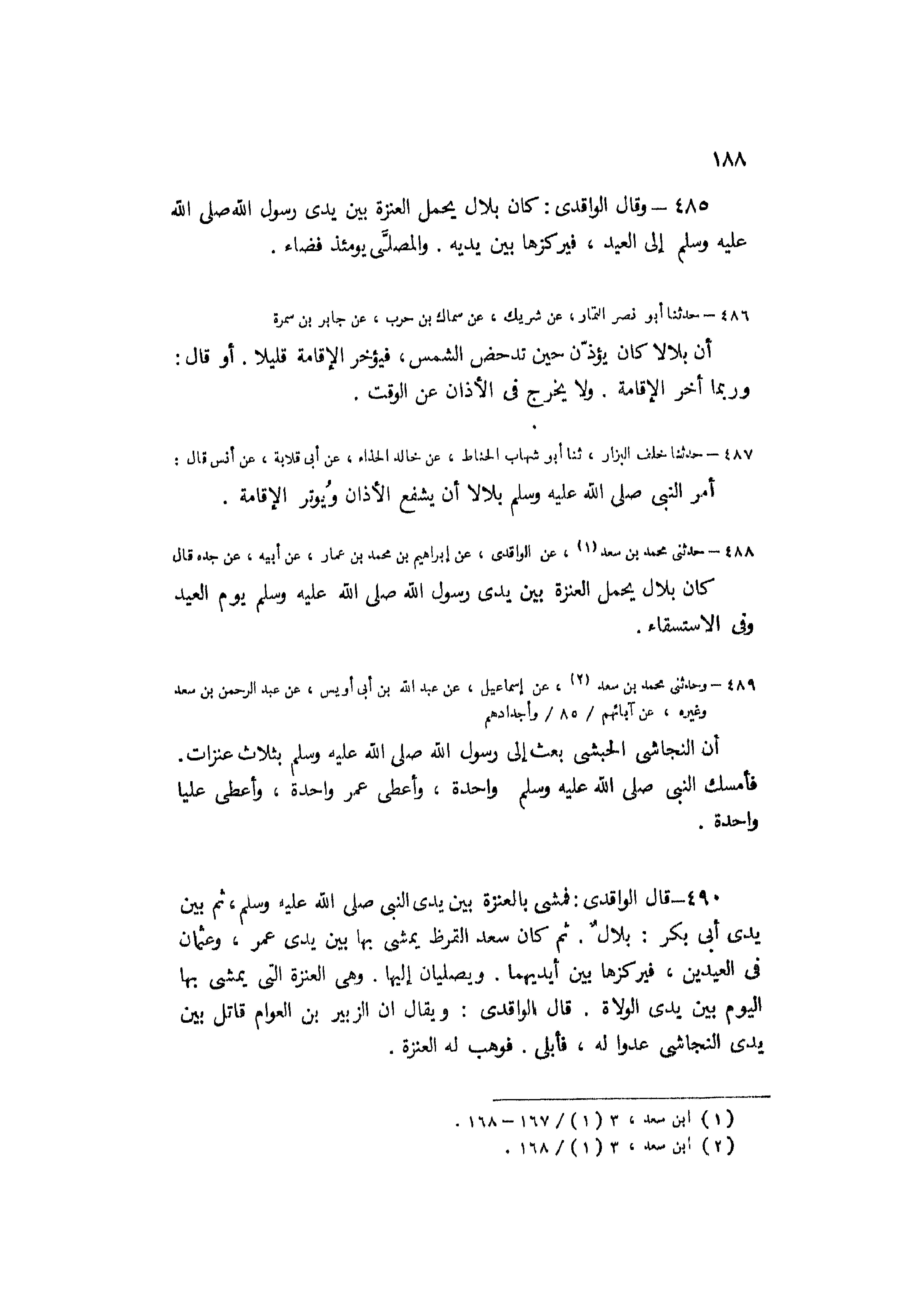 488- حَدَّثَنِي مُحَمَّدُ بْنُ سَعْدٍ [1] ، عَنِ الْوَاقِدِيِّ، عَنْ إِبْرَاهِيمَ بْنِ مُحَمَّدِ بْنِ عَمَّارٍ، عَنْ أَبِيهِ، عَنْ جَدِّهِ قَالَ كَانَ بِلالٌ يَحْمِلُ الْعَنَزَةَ بَيْنَ يَدَيْ رَسُول اللَّهِ صَلَّى اللَّهُ عَلَيْهِ وَسَلَّمَ يَوْمَ الْعِيدِ وَفِي الاسْتِسْقَاءِ.