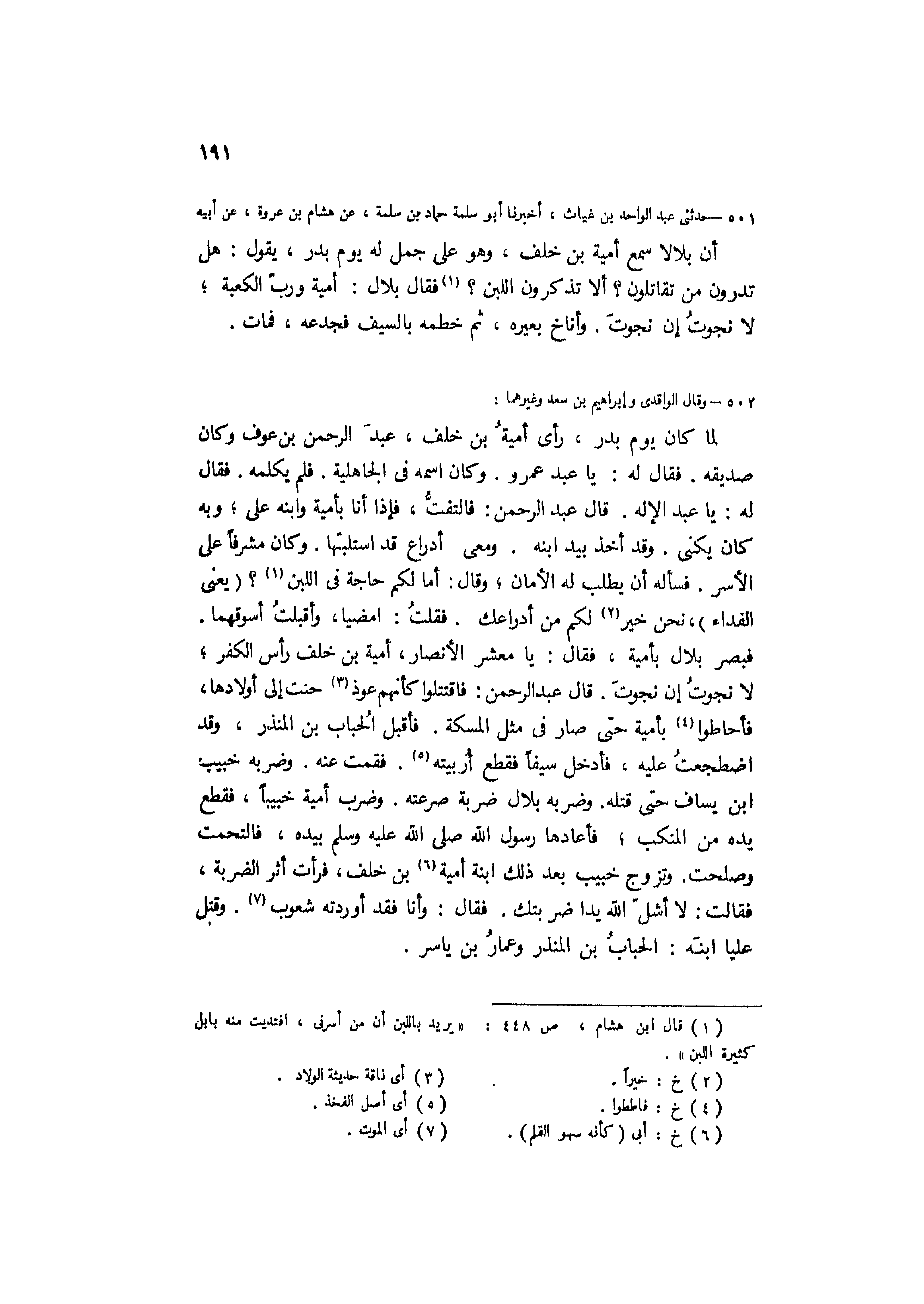 501- حَدَّثَنِي عَبْدُ الْوَاحِدِ بْنُ غِيَاثٍ، أَخْبَرَنَا أَبُو سَلَمَةَ حَمَّادُ بْنُ سَلَمَةَ، عَنْ هِشَامِ بْنِ عُرْوَةَ، عَنْ أَبِيهِ أَنَّ بِلالا سَمِعَ أُمَيَّةَ بْنَ خَلَفٍ، وَهُوَ عَلَى جَمَلٍ لَهُ يَوْمَ بَدْرٍ، يَقُولُ: هَلْ تَدْرُونَ مَنْ تُقَاتِلُونَ؟ أَلا تَذْكُرُونَ اللَّبَنَ؟ [1] فَقَالَ بِلالٌ: أُمَيَّةُ وَرَبِّ الْكَعْبَةِ، لا نَجَوْتُ إِنْ نَجَوْتَ. وَأَنَاخَ بَعِيرَهُ، ثُمَّ خَطَمَهُ بِالسَّيْفِ فَجَدَعَهُ، فَمَاتَ.
