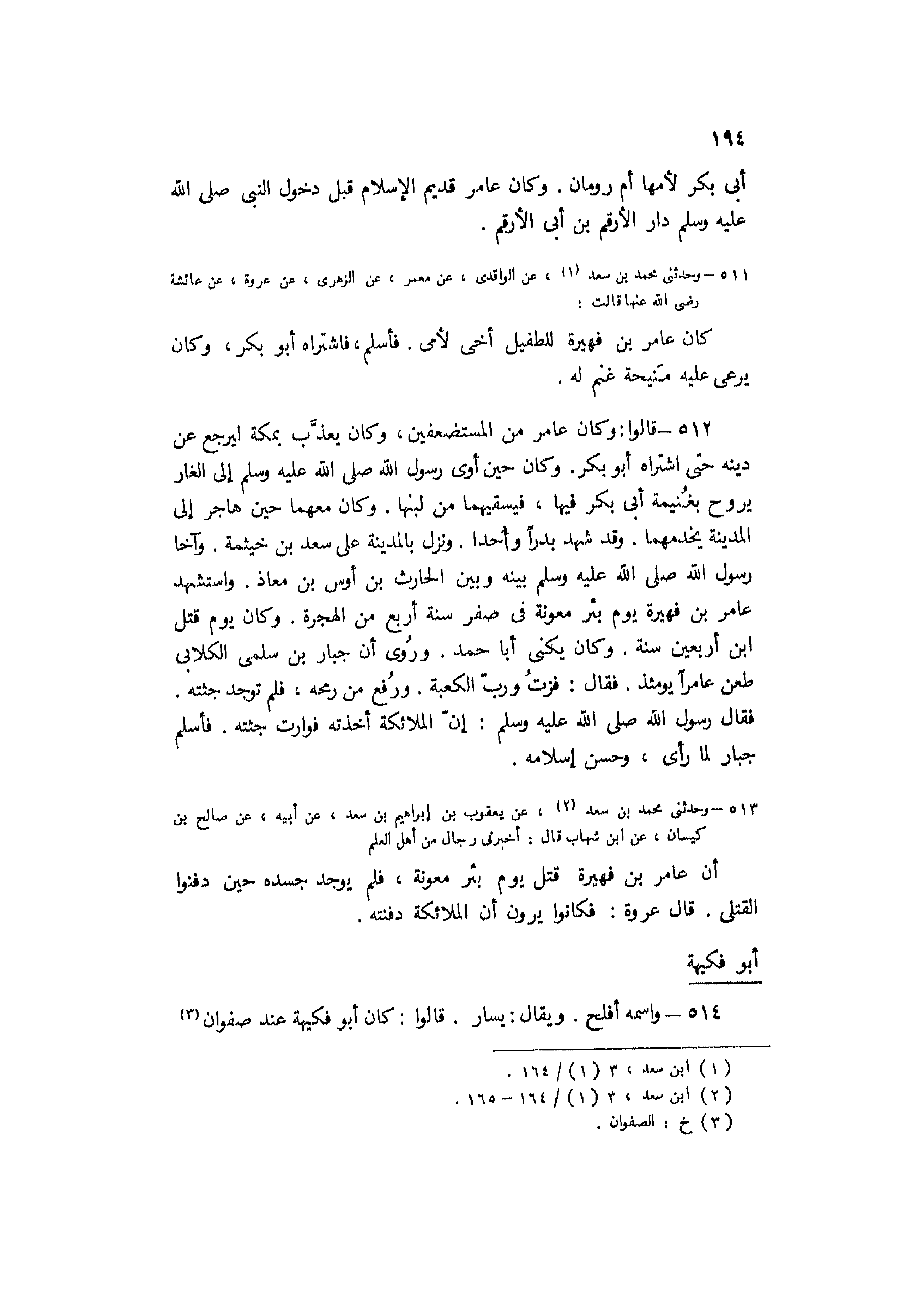 513- وحدثنى محمد بن سعد [2] ، عن يَعْقُوب بْن إِبْرَاهِيمَ بْن سَعْد، عَنْ أَبِيهِ، عن صالح بن كيسان، عن ابن شهاب قال: أخبرني رجال من أهل العلم أن عامر بن فهيرة قتل يوم بئر معونة، فلم يوجد جسده حين دفنوا القتلى. قال عروة: فكانوا يرون أن الملائكة دفنته.