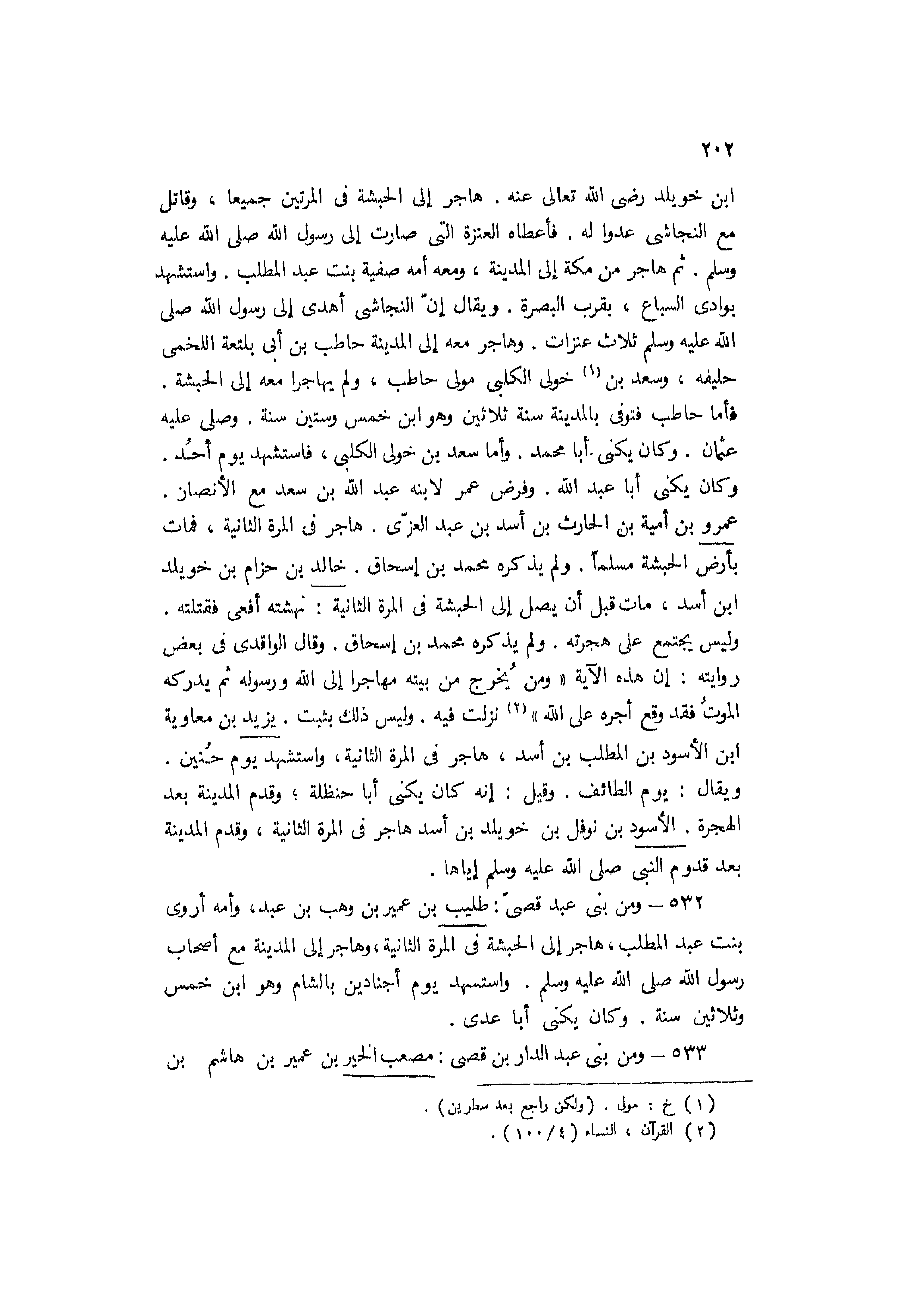 ابن خويلد رضي الله تعالى عنه. هاجر إلى الحبشة في المرتين جميعا، وقاتل مع النجاشي عدوا له. فأعطاه العنزة التي صارت إلى رسول الله صلى الله عليه وسلم. ثم هاجر من مكة إلى المدينة، ومعه أمه صفية بنت عبد المطلب. واستشهد بوادي السباع، بقرب البصرة. ويقال إن النجاشي أهدى إلى رسول الله صلى الله عليه وسلم ثلاث عنزات. وهاجر معه إلى المدينة حاطب بن أبي بلتعة اللخمي حليفه، وسعد بن [1] خولي الكلبى مولى حاطب، ولم يهاجرا معه إلى الحبشة.