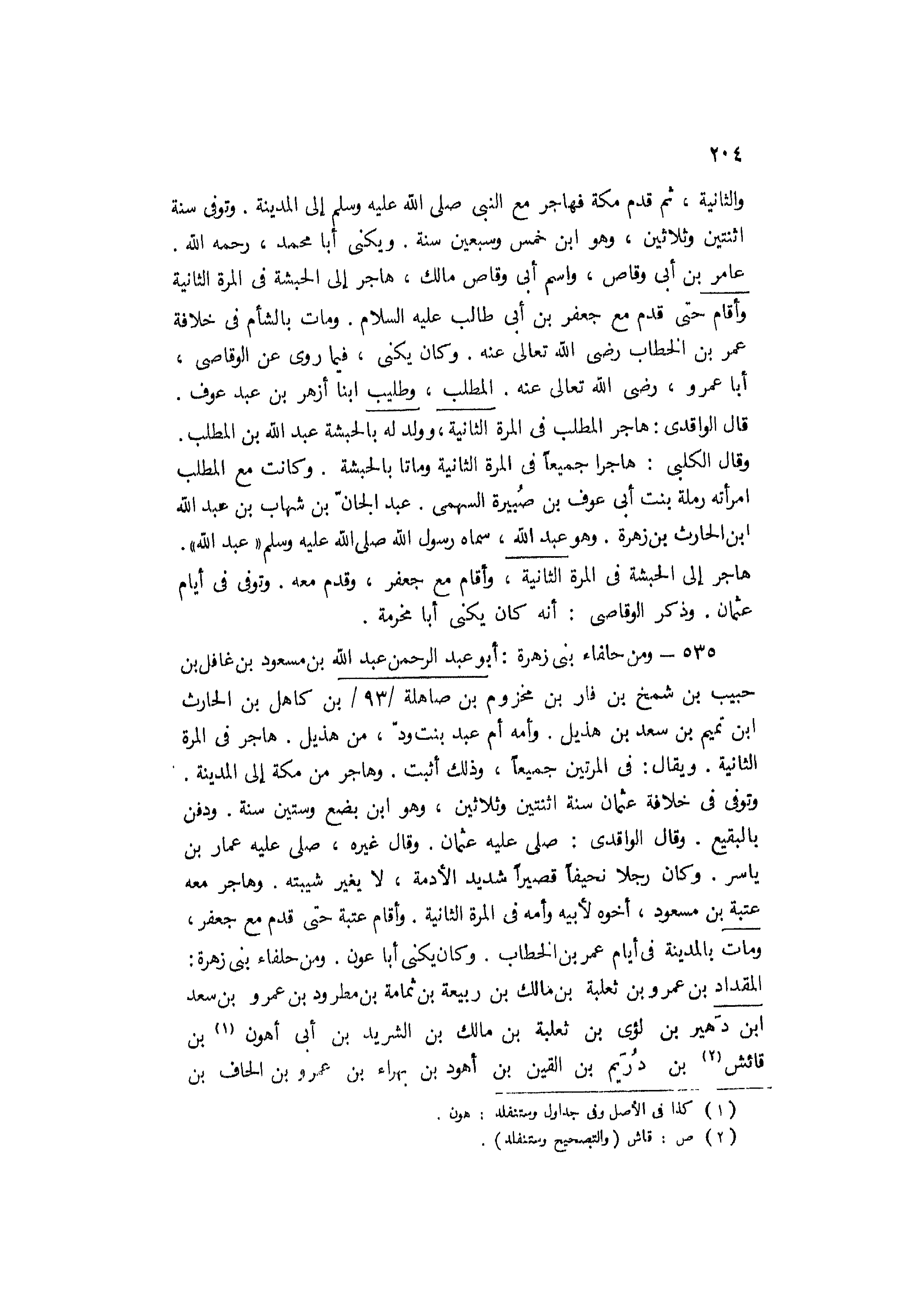 والثانية، ثم قدم مكة فهاجر مع النَّبِيِّ صَلَّى اللَّهُ عَلَيْهِ وَسَلَّمَ إِلَى الْمَدِينَةِ. وتوفي سَنَةِ اثْنَتَيْنِ وَثَلاثِينَ، وَهُوَ ابْنُ خَمْسٍ وَسَبْعِينَ سنة. ويكنى أبا محمد، رحمه الله.