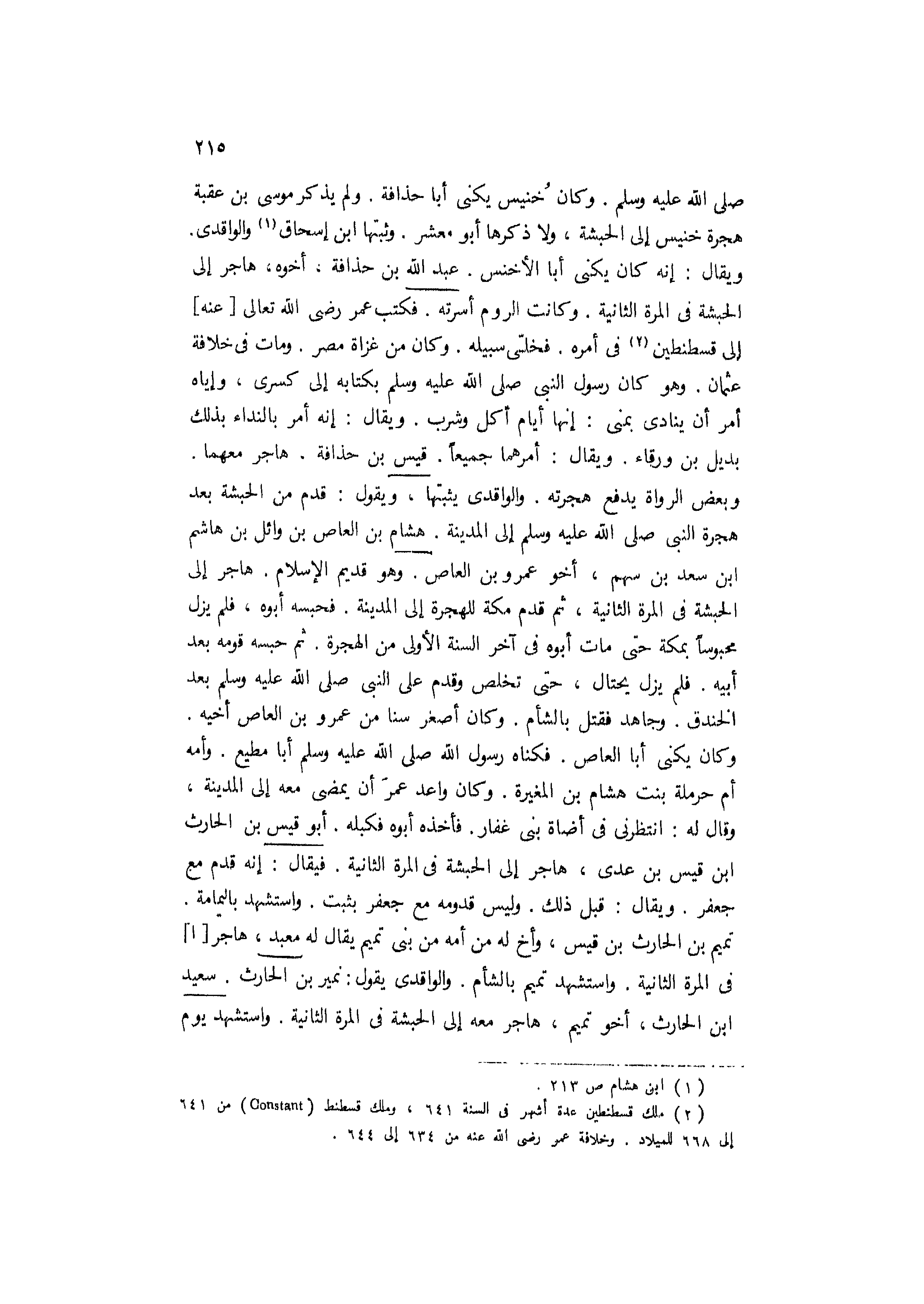 صلى اللَّه عليه وسلم. وكان خنيس يكنى أبا حذافة. ولم يذكر موسى بن عقبة هجرة خنيس إلى الحبشة، ولا ذكرها أبو معشر. وثبتها ابن إسحاق [1] والواقدي.