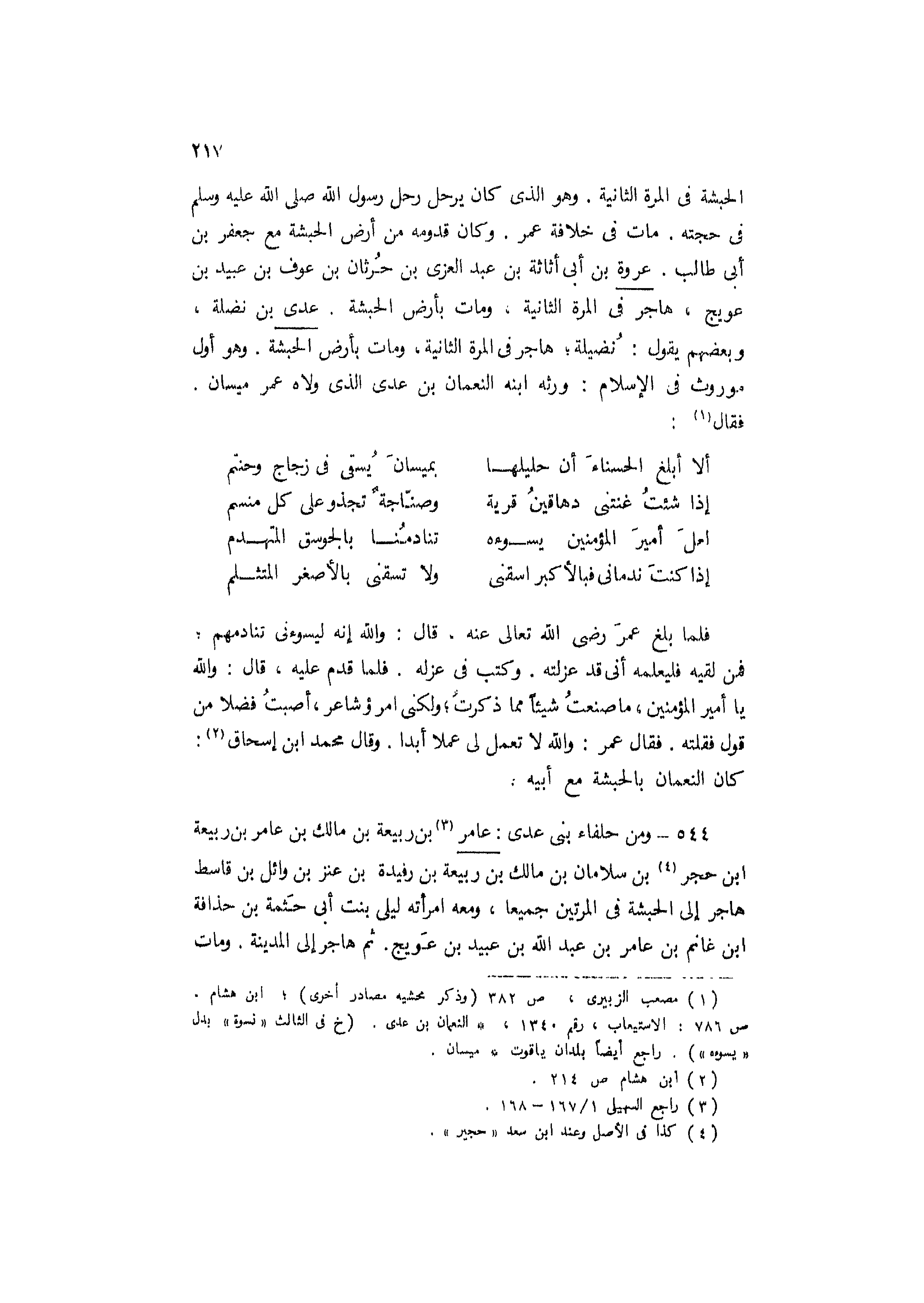 [1] مصعب الزبيري، ص 382 (وذكر محشيه مصادر أخرى) ، ابن هشام، ص 786: الاستيعاب، رقم 1340، النعمان بن عدى. (خ في الثالث «نسوة» بدل «يسوءه» ) . راجع أيضا بلدان ياقوت ميسان.