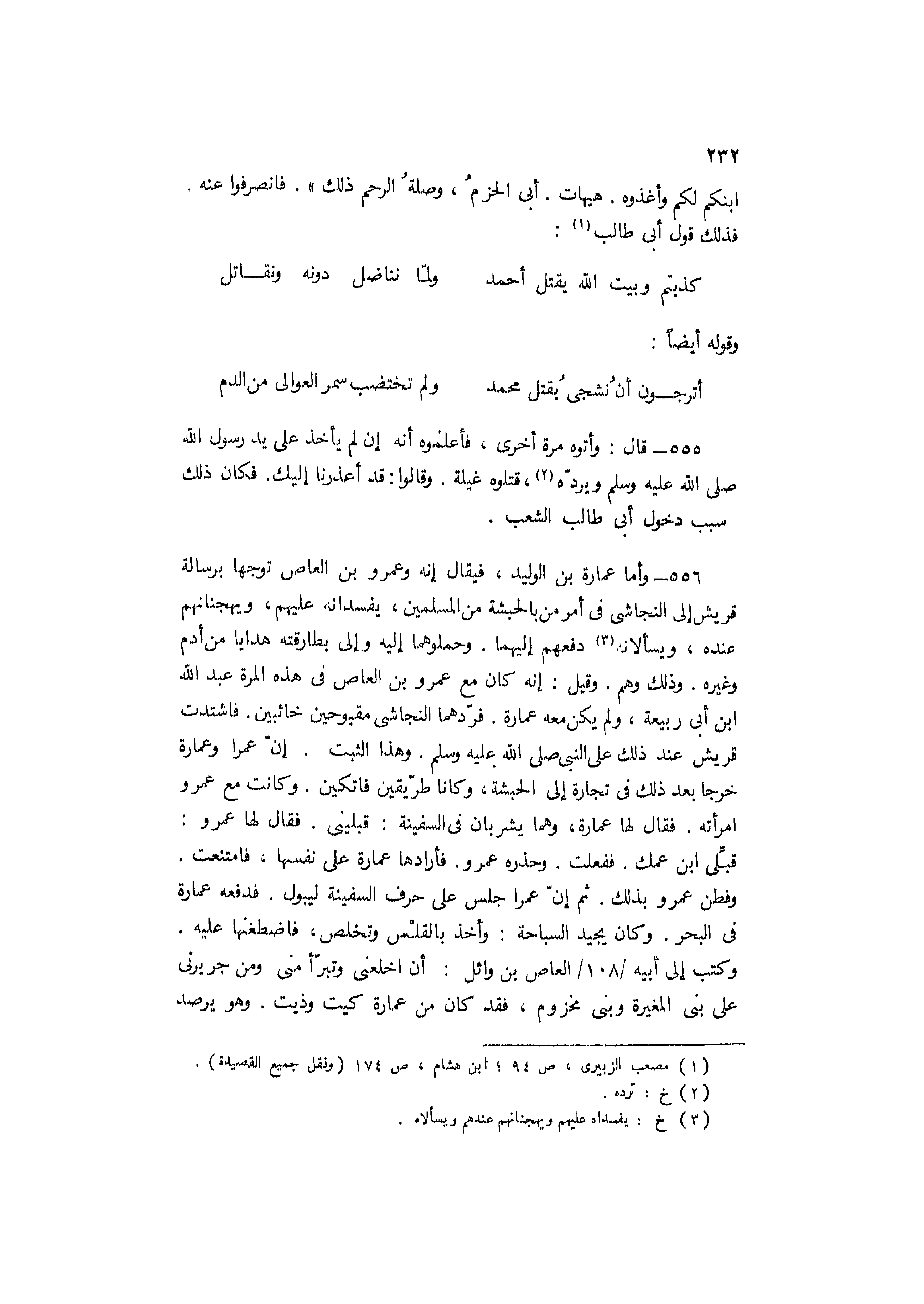 556- وأما عمارة بن الوليد، فيقال إنه وعمرو بن العاص توجها برسالة قريش إلى النجاشي في أمر من بالحبشة من المسلمين، يفسدانه عليهم، ويهجنانهم عنده، ويسألانه [3] دفعهم إليهما. وحملوهما إليه وإلى بطارقته هدايا من آدم وغيره. وذلك وهم. وقيل: إنه كان مع عمرو بن العاص في هذه المرة عبد الله ابن أبي ربيعة، ولم يكن معه عمارة. فردهما النجاشي مقبوحين خائبين. فاشتدت قريش عند ذلك على النبي صلى الله عليه وسلم. وهذا الثبت. إن عمرا وعمارة خرجا بعد ذلك في تجارة إلى الحبشة، وكانا طريقين فاتكين. وكانت مع عمرو امرأته. فقال لها عمارة، وهما يشربان في السفينة: قبليني. فقال لها عمرو: