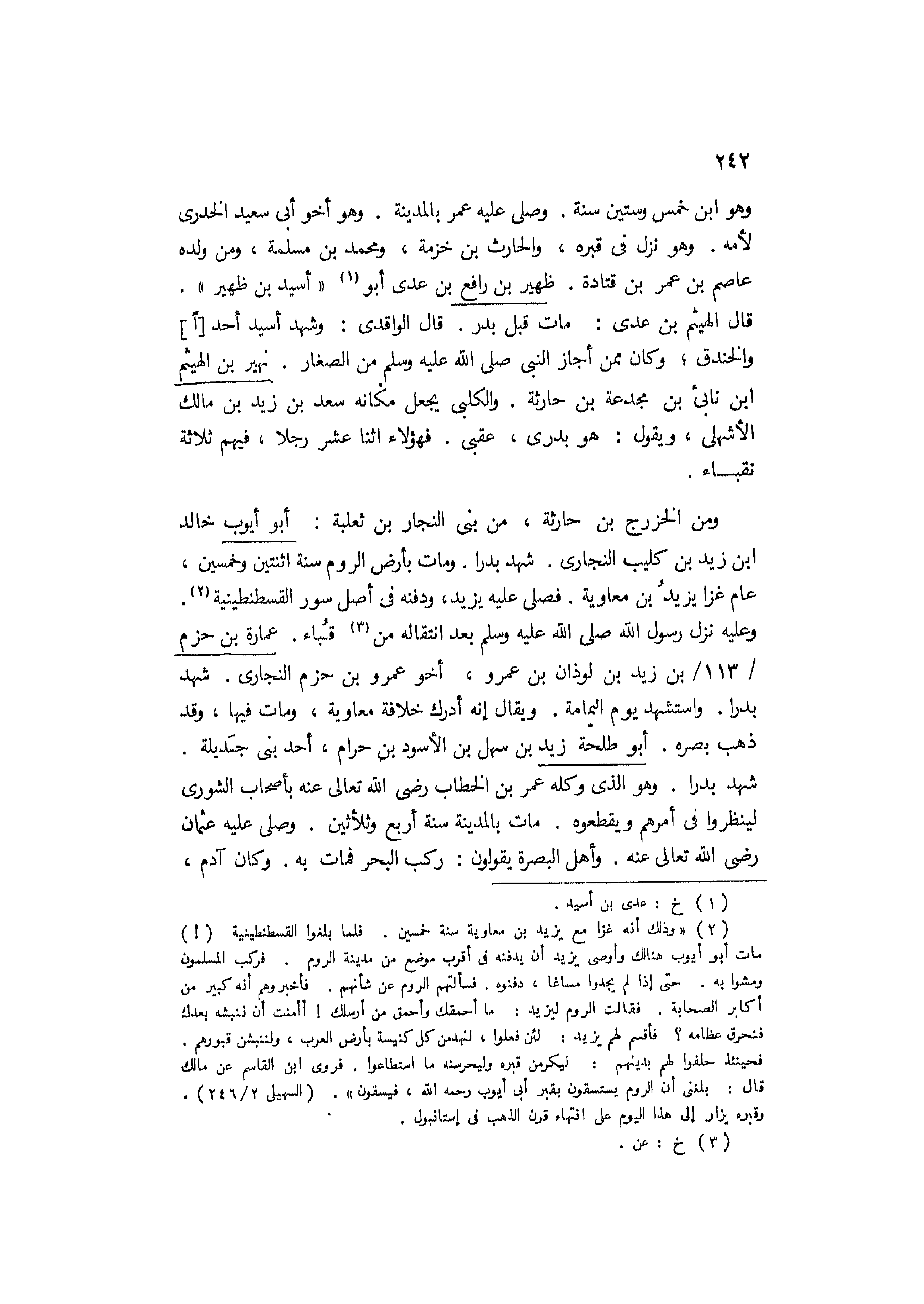 [2] «وذلك أنه غزا مع يزيد بن معاوية سنة خمسين. فلما بلغوا القسطنطينية (!) مات أبو أيوب هنا لك وأوصى يزيد أن يدفنه في أقرب موضع من مدينة الروم. فركب المسلمون ومشوا به. حتى إذا لم يجدوا مساغا، دفنوه. فسألتهم الروم عن شأنهم. فأخبروهم أنه كبير من أكابر الصحابة. فقالت الروم ليزيد: ما أحمقك وأحمق من أرسلك! أأمنت أن ننبشه بعدك فنحرق عظامه؟ فأقسم لهم يزيد: لئن فعلوا، لنهدمن كل كنيسة بأرض العرب، ولننبشن قبورهم.