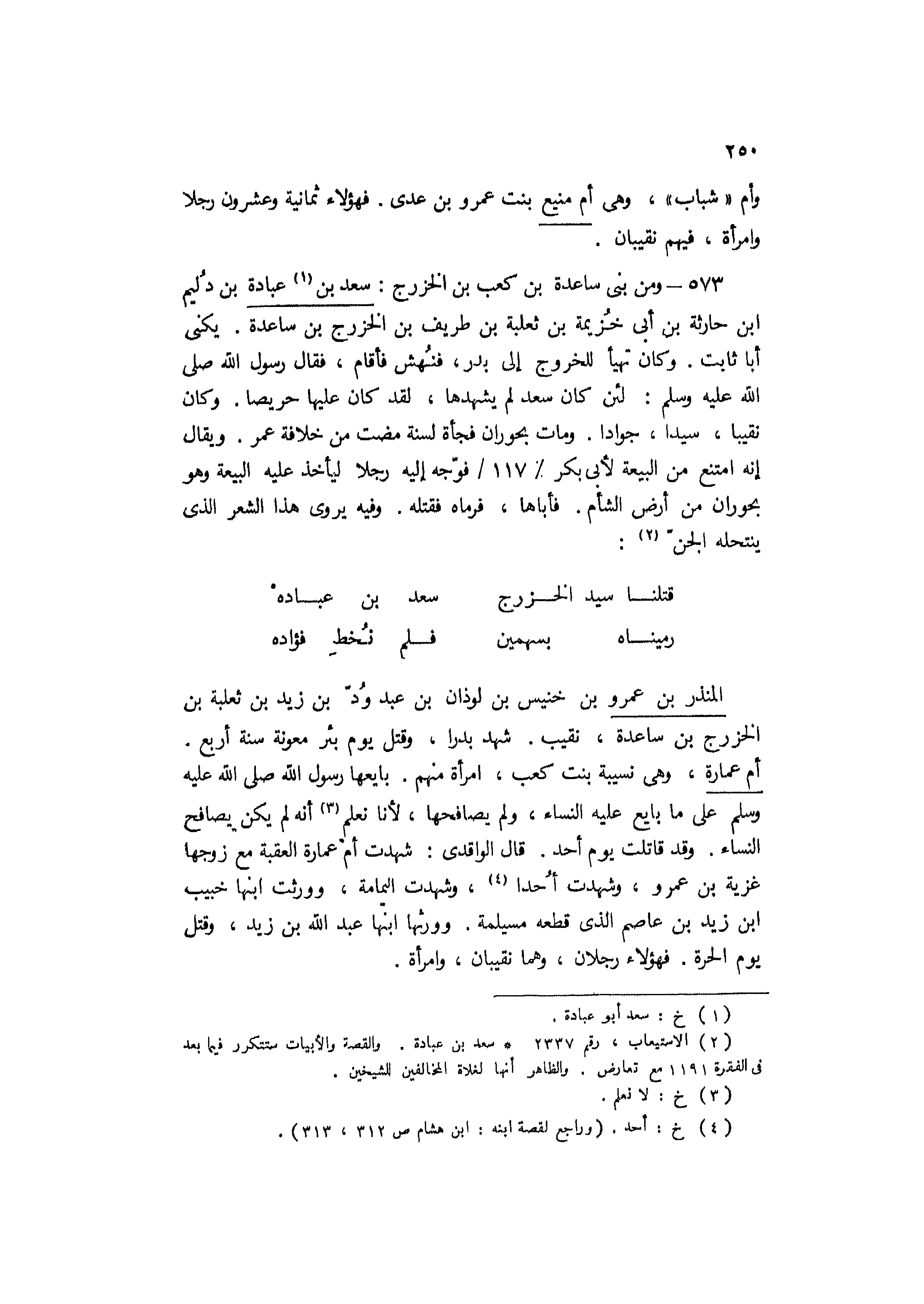 [2] الاستيعاب، رقم 2337 سعد بن عبادة. والقصة والأبيات ستتكرر فيما بعد في الفقرة 1191 مع تعارض. والظاهر أنها لغلاة المخالفين للشيخين.