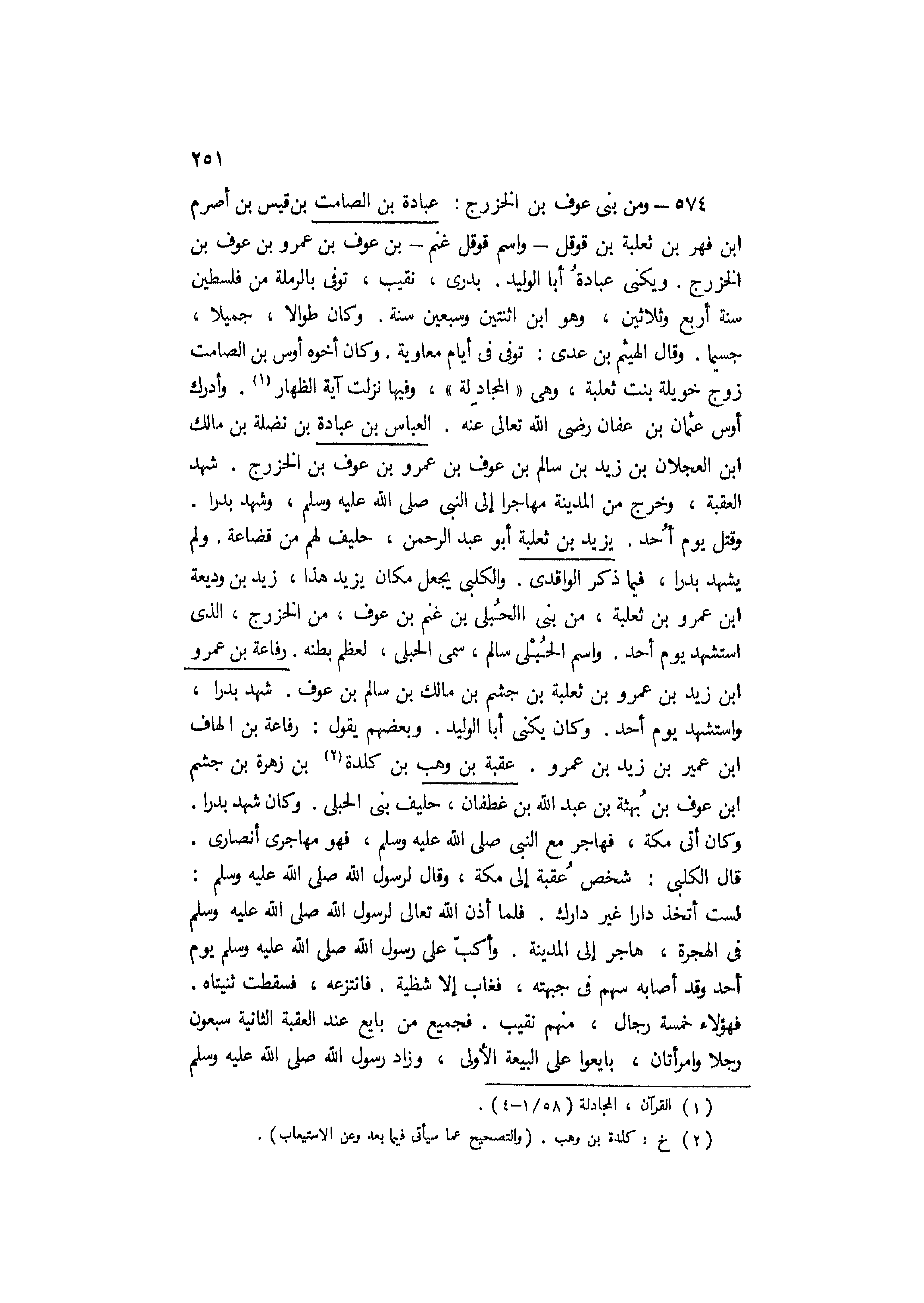 - واسم قوقل غنم- بْن عوف بْن عَمْرو بْن عوف بْن الخزرج. ويكنى عبادةُ أبا الوليد. بدري، نقيب، توفي بالرملة من فلسطين سنة أربع وثلاثين، وهو ابْنُ اثنتين وسبعين سنة. وكان طوالًا، جميلًا، جسيمًا. وقَالَ الهيثم بْن عدي: توفي فِي أيام معاوية. وكان أخوه أوس بْن الصامت زوج خويلة بِنْت ثعلبة، وهي «المجادِلة» ، وفيها نزلت آية الظهار [1] . وأدرك أوس عُثْمَان بْن عَفَّان رَضِي اللَّه تَعَالى عَنْهُ.