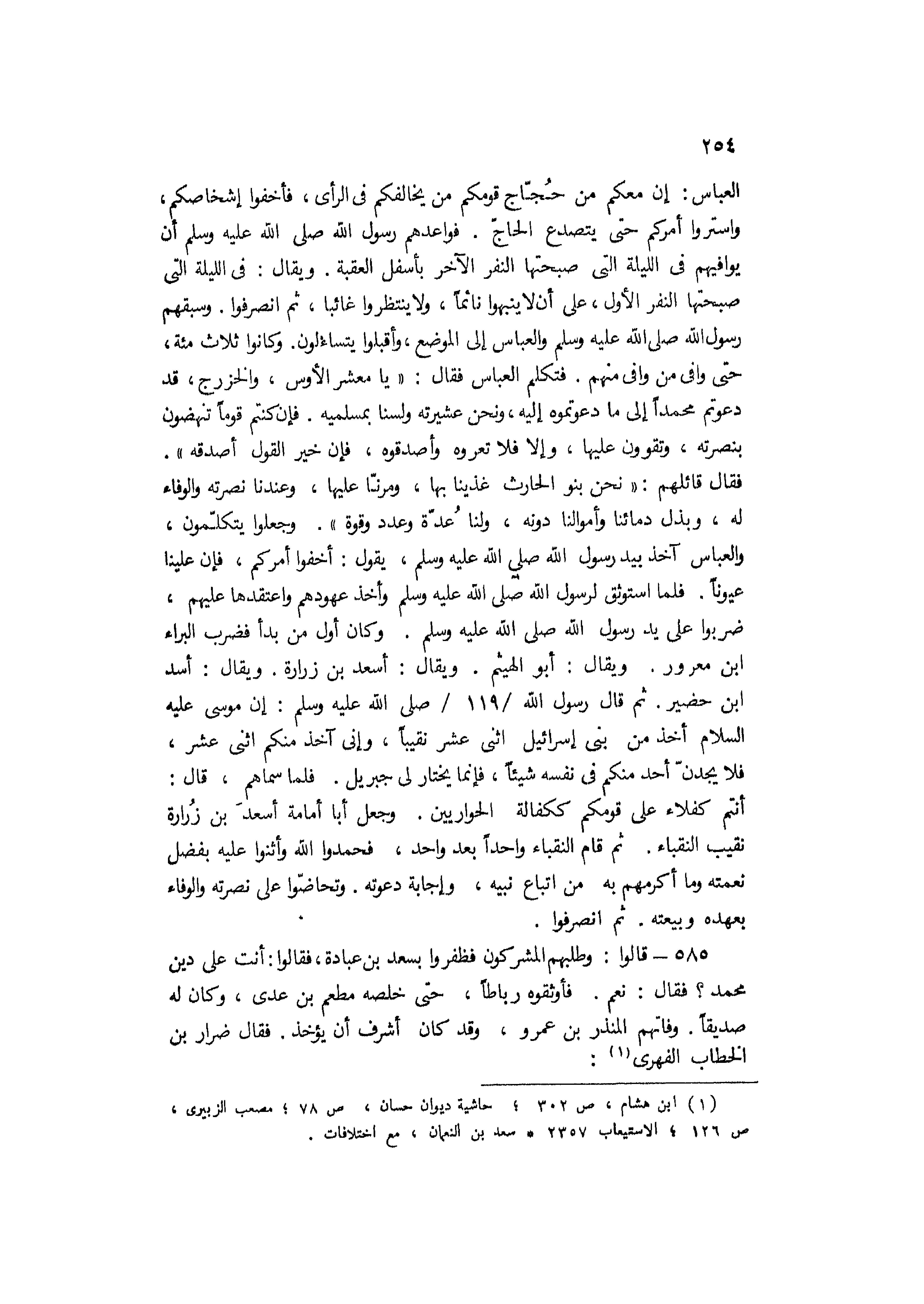 الْعَبَّاسُ: إِنَّ مَعَكُمْ مِنْ حُجَّاجِ قَوْمِكُمْ مَنْ يُخَالِفُكُمْ فِي الرَّأْيِ، فَأَخْفُوا إِشْخَاصَكُمْ، وَاسْتُرُوا أَمْرَكُمْ حَتَّى يَتَصَدَّعَ الْحَاجُّ. فَوَاعَدَهُمْ رَسُولُ اللَّهِ صَلَّى اللَّهُ عَلَيْهِ وَسَلَّمَ أَنْ يُوَافِيَهُمْ فِي اللَّيْلَةِ الَّتِي صَبَّحَتْهَا النَّفَرُ الآخِرُ بِأَسْفَلِ الْعَقَبَةِ. وَيُقَالُ: فِي اللَّيْلَةِ الَّتِي صَبَّحَتْهَا النَّفَرُ الأَوَّلُ، عَلَى أن لا ينبهوا نائما، ولا ينتظروا غَائِبًا، ثُمَّ انْصَرَفُوا. وَسَبَقَهُمْ رَسُولُ اللَّهِ صَلَّى اللَّهُ عَلَيْهِ وَسَلَّمَ وَالْعَبَّاسُ إِلَى الْمَوْضِعِ، وَأَقْبَلُوا يتساءلون. وَكَانُوا ثَلاثَ مِائَةٍ، حَتَّى وَافَى مَنْ وَافَى مِنْهُمْ. فَتَكَلَّمَ الْعَبَّاسُ فَقَالَ: «يَا مَعْشَرَ الأَوْسِ، وَالْخَزْرَجِ، قَدْ دَعَوْتُمْ مُحَمَّدًا إِلَى مَا دَعَوْتُمُوهُ إِلَيْهِ، وَنَحْنُ عَشِيرَتُهُ وَلَسْنَا بِمُسْلِمِيهِ. فَإِنْ كُنْتُمْ قَوْمًا تَنْهَضُونَ بِنُصْرَتِهِ، وَتَقْوُونَ عَلَيْهَا، وَإِلا فَلا تعروه وَأَصْدِقُوهُ، فَإِنَّ خَيْرَ الْقَوْلِ أَصْدَقُهُ» .
