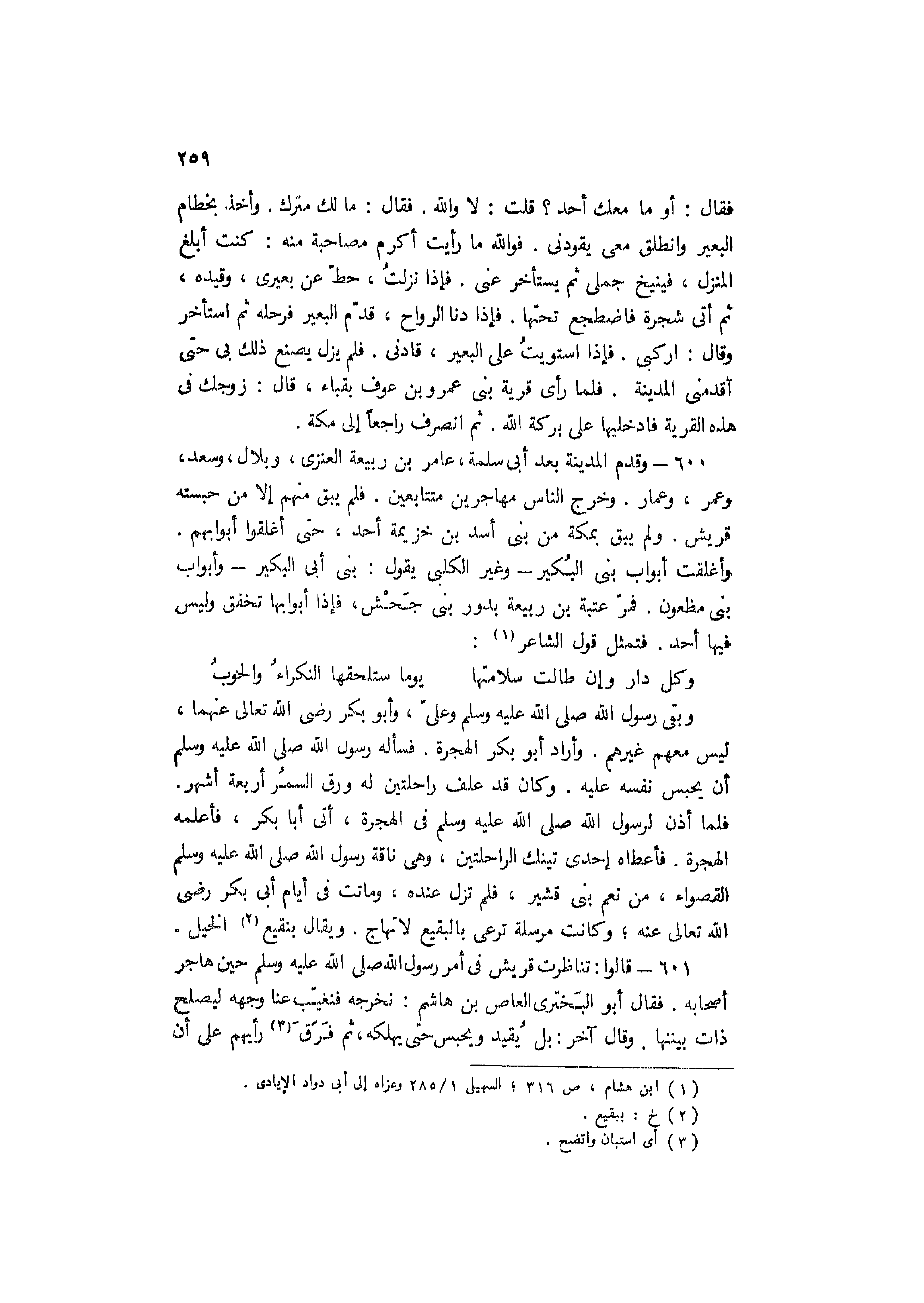 601- قَالُوا: تناظرت قريش فِي أَمَرَ رَسُول اللَّهِ صَلَّى اللَّهُ عَلَيْهِ وَسَلَّمَ حين هاجر أصحابه. فَقَالَ أَبُو البَختري العاص بْن هاشم: نخرجه فنغيب عنا وجهه ليصلح ذات بينها. وقَالَ آخر: بل يُقيد ويحبس حتَّى يهلكه، ثم فرق [3] رأيهم على أن