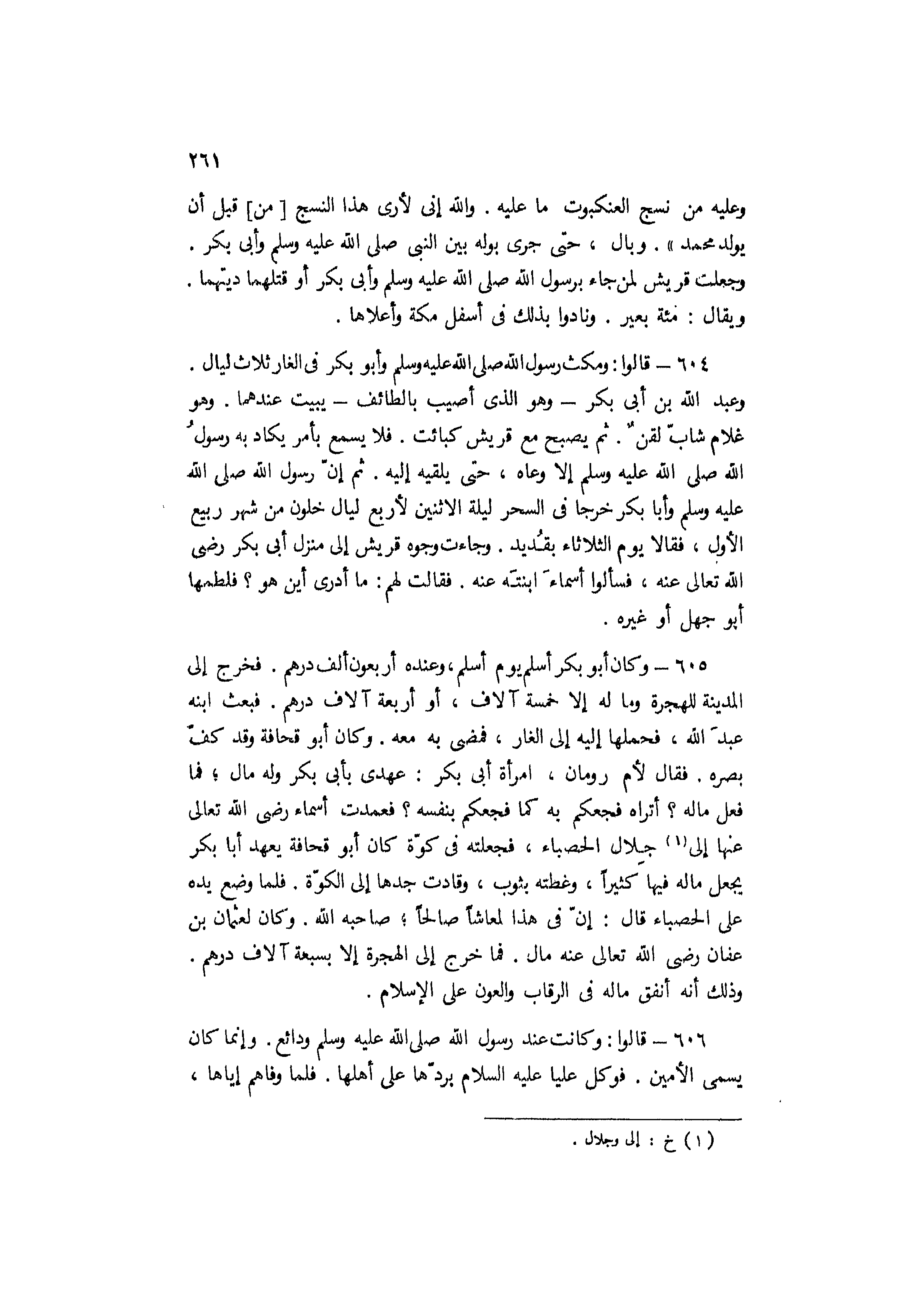 وعليه من نسج العنكبوت ما عَلَيْهِ. والله إنى لأرى هذا النسج (من) قبل أن يولد مُحَمَّد» . وبال، حتَّى جرى بوله بين النَّبِيِّ صَلَّى اللَّهُ عَلَيْهِ وَسَلَّمَ وأَبِي بَكْر.