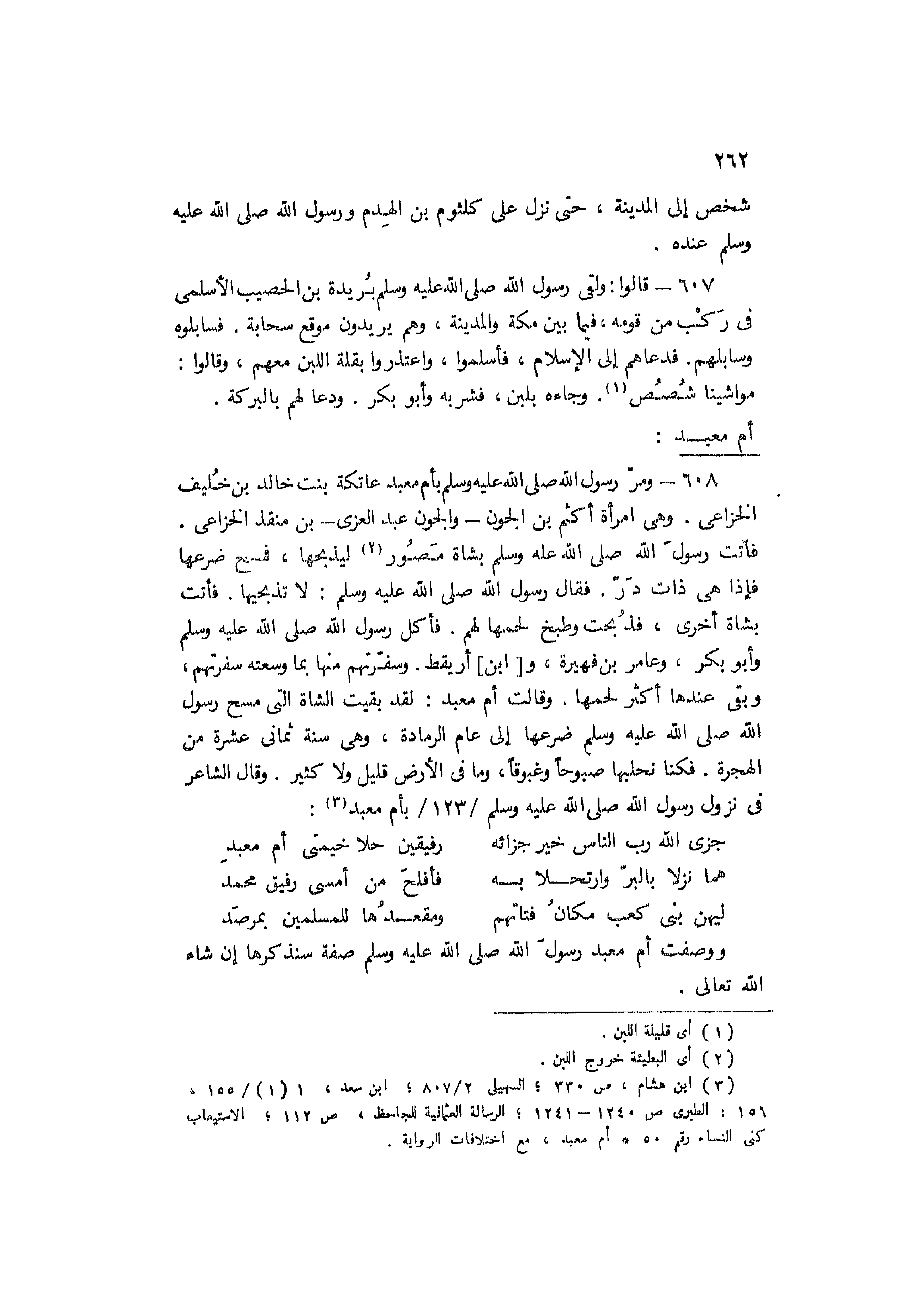 [3] ابن هشام، ص 330، السهيلي 2/ 807، ابن سعد، 1 (1) / 155، 156: الطبرى ص 1240- 1241، الرسالة العثمانية للجاحظ، ص 112، الاستيعاب كنى النساء رقم 50 أم معبد، مع اختلافات الرواية.