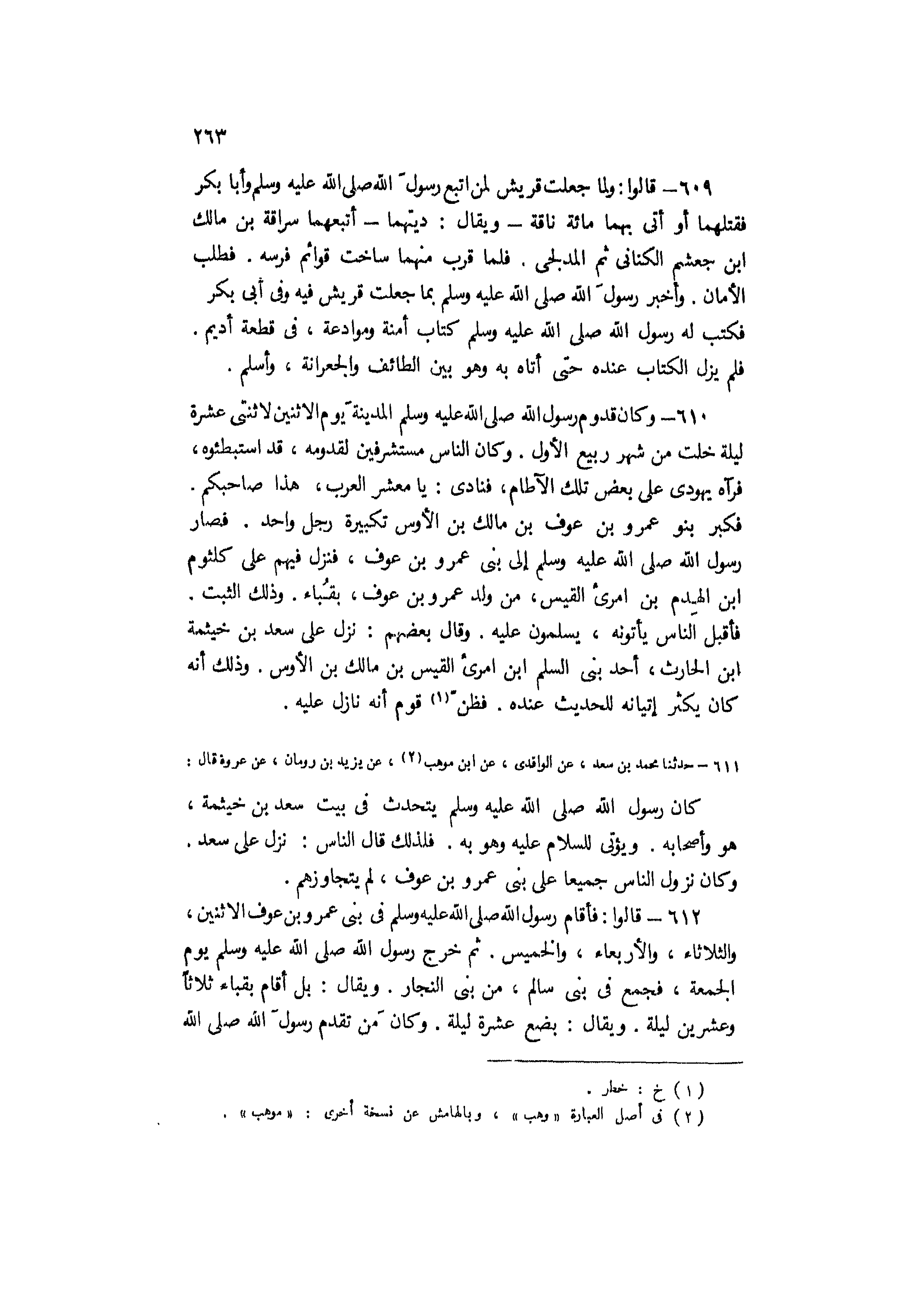 611- حَدَّثَنَا مُحَمَّدُ بْنُ سَعْدٍ، عَنِ الْوَاقِدِيِّ، عَنِ ابْنِ مَوْهِبٍ [2] ، عَنْ يزيد بن رومان، عن عروة قَالَ: كَانَ رَسُولُ اللَّهِ صَلَّى اللَّهُ عَلَيْهِ وَسَلَّمَ يَتَحَدَّثُ فِي بَيْتِ سَعْدِ بْنِ خَيْثَمَةَ، هُوَ وَأَصْحَابُهُ. وَيُؤْتَى لِلسَّلامِ عَلَيْهِ وَهُوَ بِهِ. فَلِذَلِكَ قَالَ النَّاسُ: نَزَلَ عَلَى سَعْدٍ.
