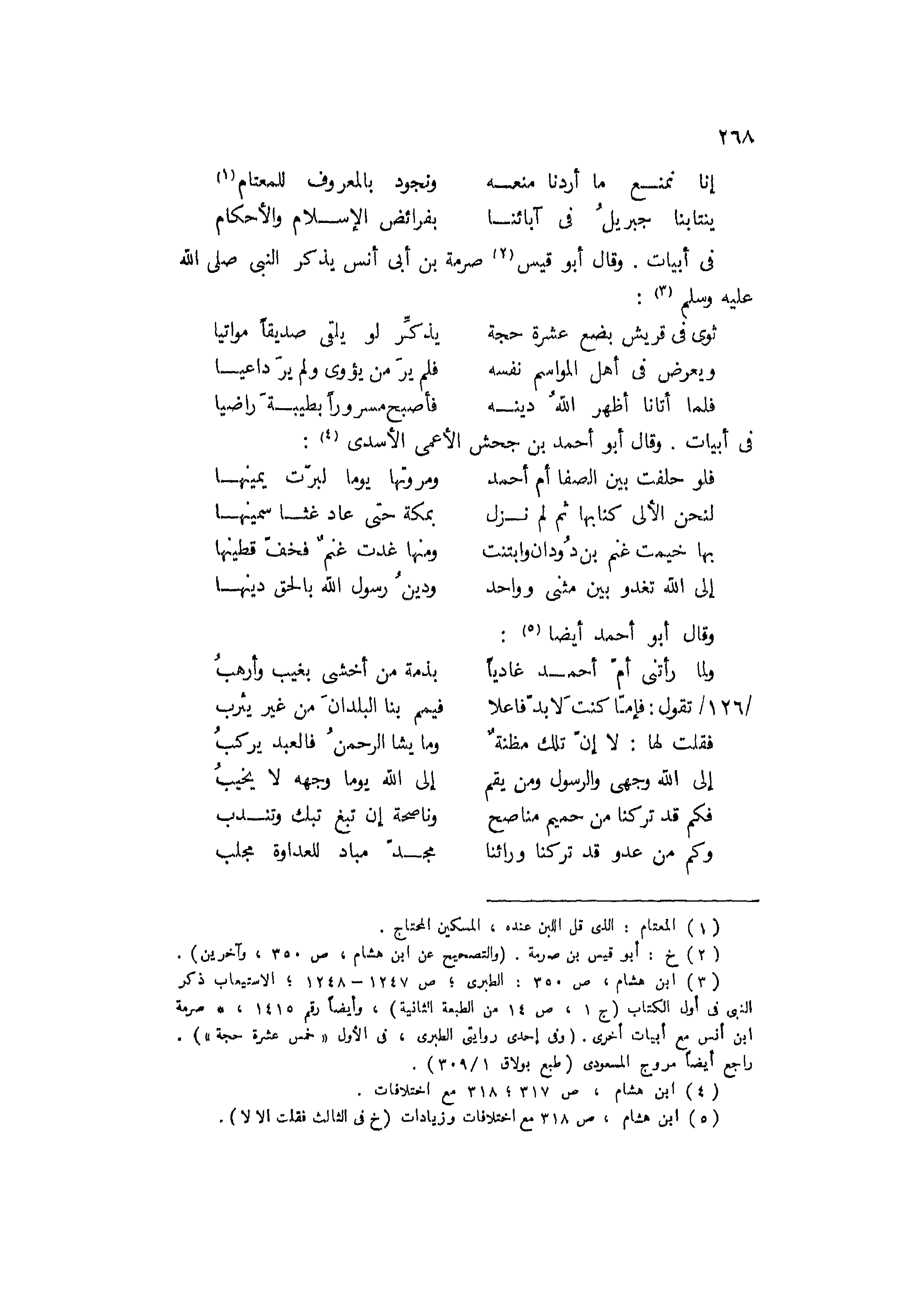 [3] ابن هشام، ص 350: الطبرى، ص 1247- 1248، الاستيعاب ذكر النبي في أول الكتاب (ج 1، ص 14 من الطبعة الثانية) ، وأيضا رقم 1415، صرمة ابن أنس مع أبيات أخرى. (وفي إحدى روايتي الطبرى، في الأول «خمس عشرة حجة» ) .