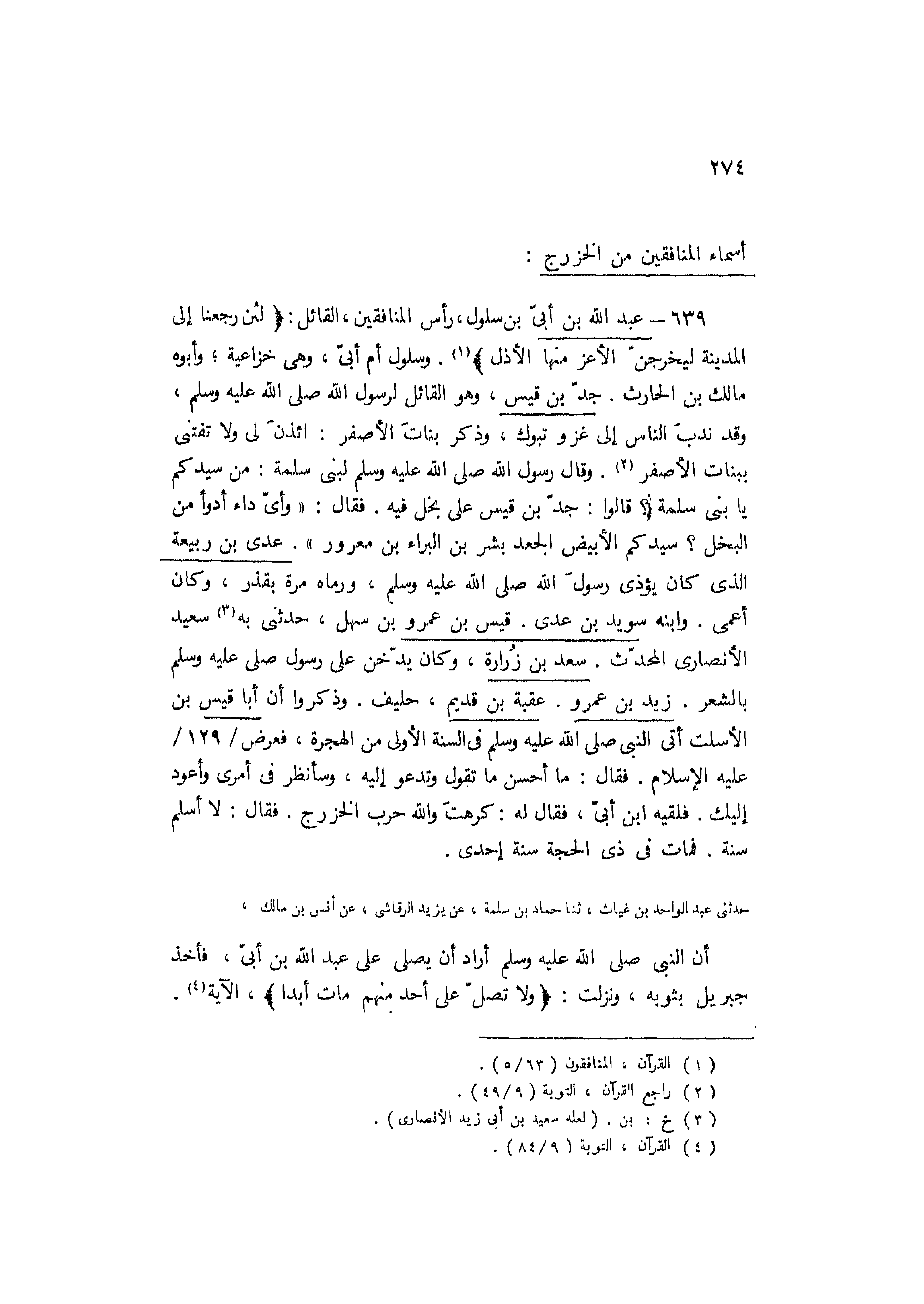 639- عَبْد اللَّه بْن أَبِيّ بْن سلول، رأس المنافقين، القائل: لَئِنْ رَجَعْنا إِلَى الْمَدِينَةِ لَيُخْرِجَنَّ الْأَعَزُّ مِنْهَا الْأَذَلَّ [1] . وسلول أم أبيّ، وهي خزاعية، وأبوه مالك بْن الحارث. جدّ بْن قيس، وهو القائل لرسول اللَّه صَلَّى اللَّهُ عَلَيْهِ وَسَلَّمَ، وَقَدْ ندبَ النَّاس إلى غزو تبوك، وذكر بناتَ الأصفر: ائذن لي ولا تفتني ببنات الأصفر [2] . [وقَالَ رَسُول اللَّه صَلَّى اللَّهُ عَلَيْهِ وَسَلَّمَ لبني سَلَمة: من سيدكم يا بني سَلَمة؟ قَالُوا: جدّ بْن قيس عَلَى بخل فِيهِ. فَقَالَ: «وأيّ داء أدوأ من البخل؟ سيدكم الأبيض الجعد بشر بْن البراء بْن معرور] » . عدي بْن ربيعة الَّذِي كَانَ يؤذي رسول الله صلى الله عليه وسلم، ورماه مرة بقذر، وكان أعمى. وابنه سويد بْن عدي. قيس بْن عَمْرو بْن سهل، حدثنى به [3] سَعِيد الْأَنْصَارِيّ المحدّث. سعد بْن زُرارة، وكان يدّخن على رسول صلى عَلَيْهِ وَسَلَّمَ بالشعر. زَيْد بْن عَمْرو. عقبة بْن قديم، حليف. وذكروا أن أبا قيس بْن الأسلت أتى النَّبِيّ صَلَّى اللَّهُ عَلَيْهِ وَسَلَّمَ فِي السنة الأولى من الهجرة، فعرض/ 129/ عَلَيْهِ الْإِسْلَام. فَقَالَ: ما أحسن ما تَقُولُ وتدعو إِلَيْه، وسأنظر فِي أمري وأعود إليك. فلقيه ابْنُ أبيّ، فَقَالَ لَهُ: كرهتَ والله حرب الخزرج. فَقَالَ: لا أسلم سنة. فمات فِي ذي الحجة سنة إحدى.