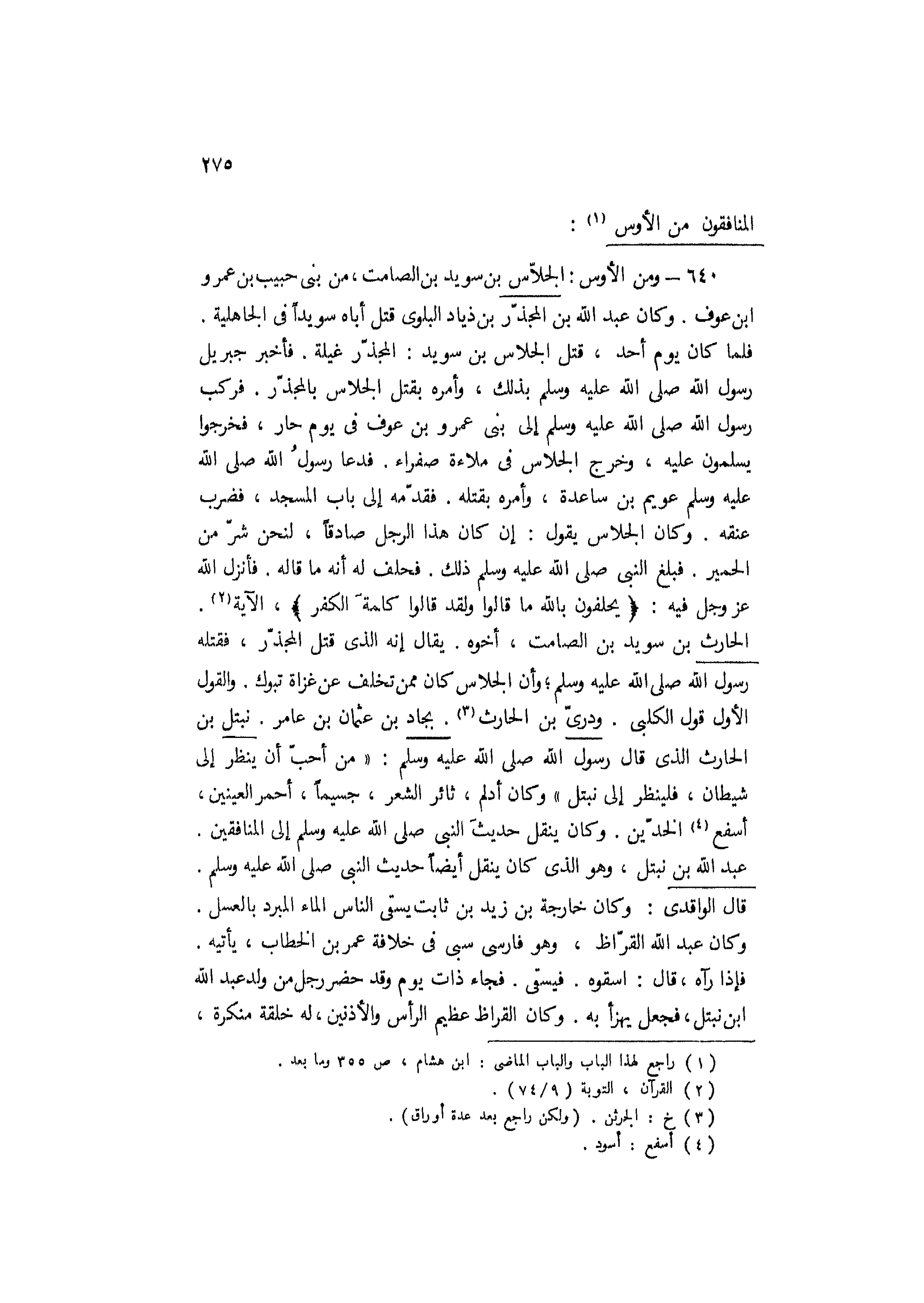 الحارث بْن سويد بْن الصامت، أخوه. يُقال إنه الَّذِي قتل المجذّر، فقتله رَسُول اللَّه صَلَّى اللَّهُ عَلَيْهِ وَسَلَّمَ، وأن الجلاس كَانَ ممن تخلف عن غزاة تبوك. والقول الأول قول الكلبي. ودُريّ بْن الحارث [3] . بجاد بْن عثمان بْن عامر. نبتل بْن الحارث الَّذِي [قَالَ رَسُول اللَّه صَلَّى اللَّهُ عَلَيْهِ وَسَلَّمَ: «من أحبّ أن ينظر إلى شيطان، فلينظر إلى نبتل] » وكان أدلم، ثائر الشعر، جسيمًا، أحمر العينين، أسفع [4] الخدّين. وكان ينقل حديث النَّبِيّ صَلَّى اللَّهُ عَلَيْهِ وَسَلَّمَ إلى المنافقين.