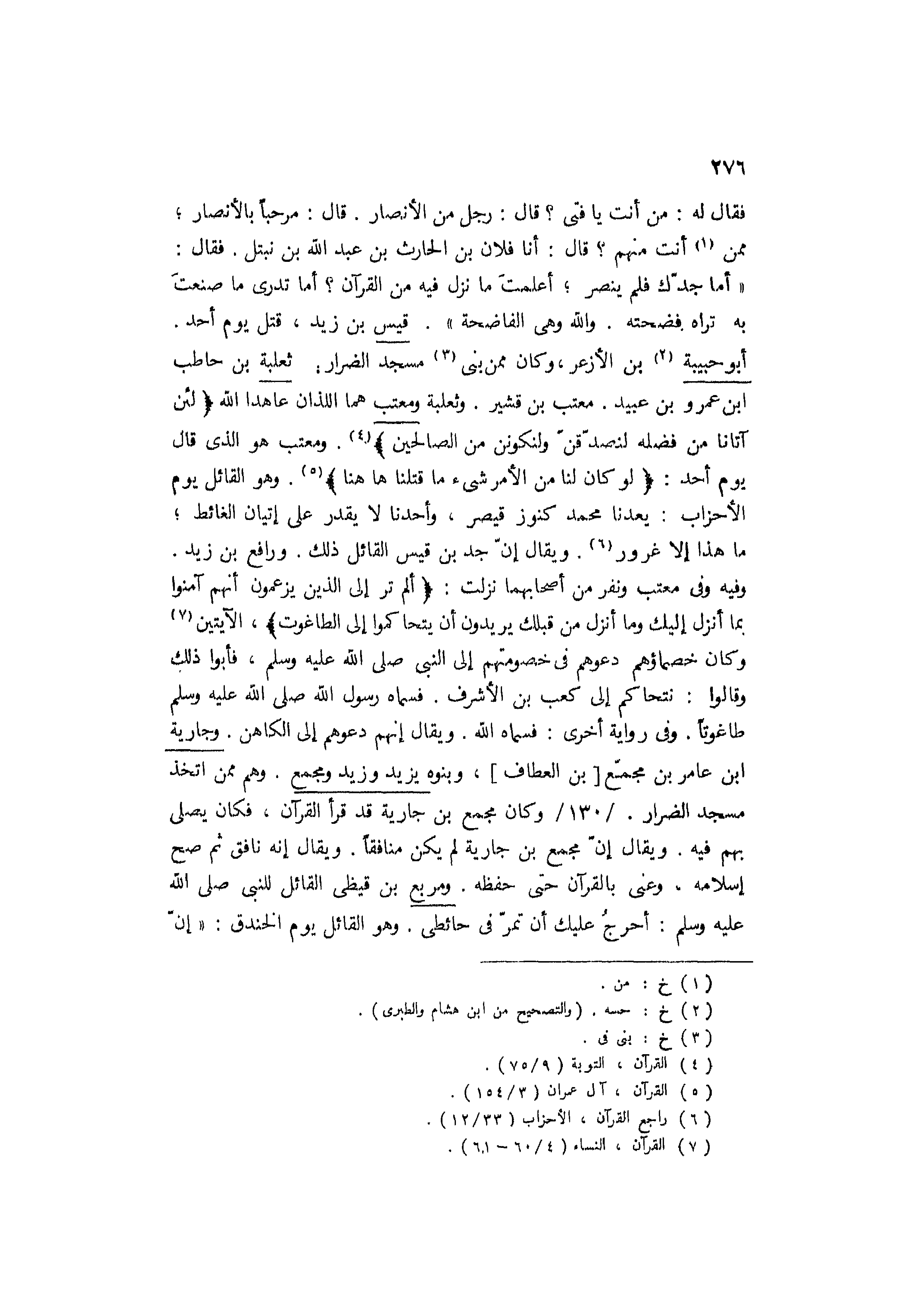 وفيه وفي معتب ونفر من أصحابهما نزلت: أَلَمْ تَرَ إِلَى الَّذِينَ يَزْعُمُونَ أَنَّهُمْ آمَنُوا بِما أُنْزِلَ إِلَيْكَ وَما أُنْزِلَ مِنْ قَبْلِكَ يُرِيدُونَ أَنْ يَتَحاكَمُوا إِلَى الطَّاغُوتِ) ، الآيتين [7] وكان خصماؤهم دعوهم فِي خصومتهم إلى النَّبِيّ صَلَّى اللَّهُ عَلَيْهِ وَسَلَّمَ، فأبوا ذَلِكَ وقالوا: نتحاكم إلى كعب بْن الأشرف. فسماه رَسُول اللَّه صَلَّى اللَّهُ عَلَيْهِ وَسَلَّمَ طاغوتًا. وفي رواية أخرى: فسماه اللَّه. وَيُقَالُ إنهم دعوهم إلى الكاهن. وجارية ابن عامر بن مجمّع (بن العطاف، وبنوه يزيد وزيد ومجمع. وهم ممن اتخذ مسجد الضرار. / 130/ وكان مجمع بْن جارية قَدْ قَرَأَ القرآن، فكان يصلي بهم فِيهِ. وَيُقَالُ إنّ مجمع بْن جارية لم يكن منافقًا. وَيُقَالُ إنه نافق ثُمَّ صح إسلامه، وعني بالقرآن حتَّى حفظه. ومربع بْن قيظي القائل للنبي صَلَّى اللَّهُ عَلَيْهِ وَسَلَّمَ: أحرجُ عليك أن تمرّ فِي حائطي. وهو القائل يوم الخندق: «إِنَ