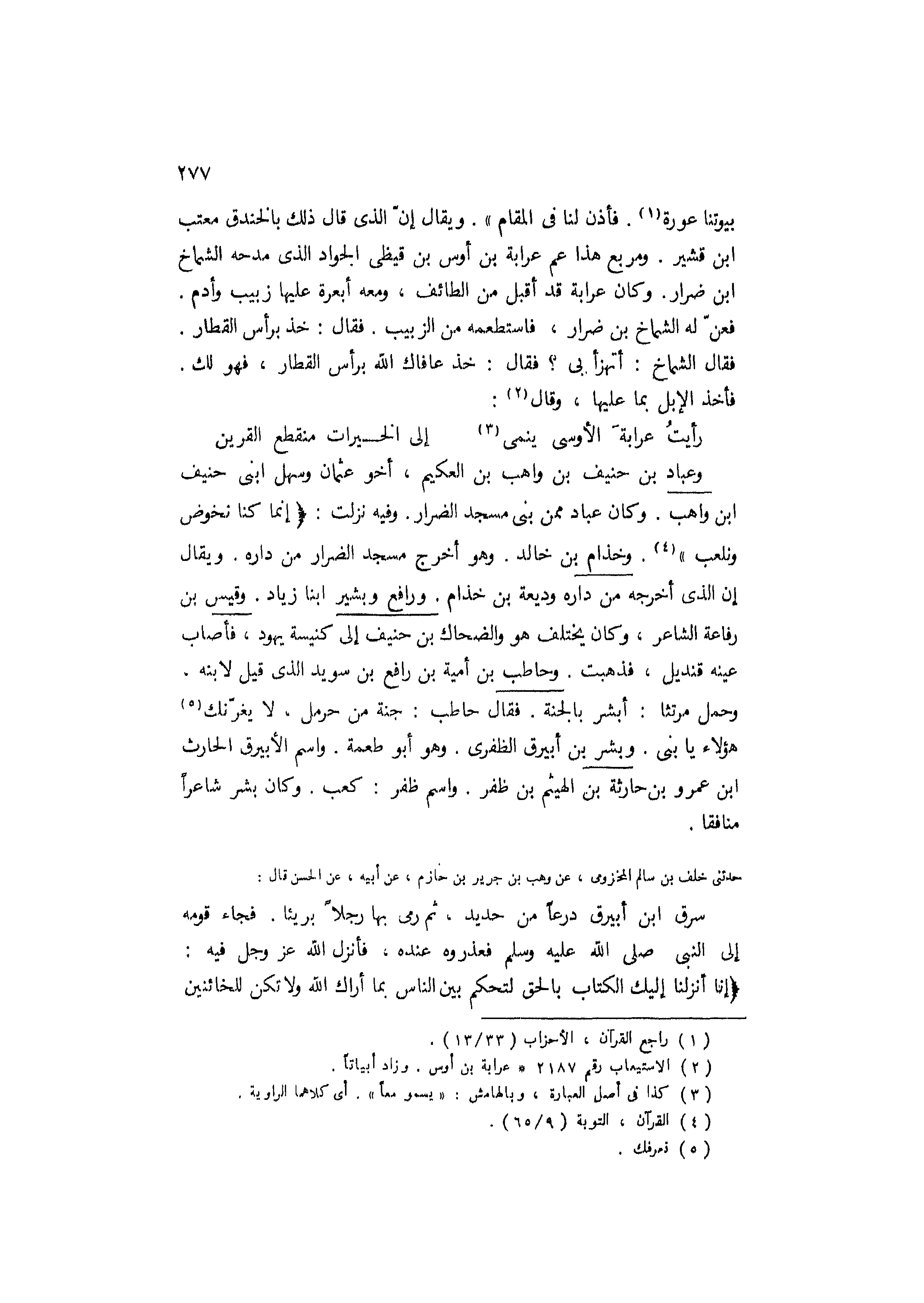 وعباد بْن حنيف بْن واهب بْن العكيم، أخو عثمان وسهل ابنى حنيف ابن واهب. وكان عباد ممن بنى مسجد الضرار. وفيه نزلت: إِنَّما كُنَّا نَخُوضُ وَنَلْعَبُ [4] » . وخِذام بْن خَالِد. وهو أخرج مسجد الضرار من داره. وَيُقَالُ إن الَّذِي أَخْرَجَهُ من داره وديعة بْن خذام. ورافع وبشير ابنا زياد. وقيس بْن رفاعة الشَّاعِر، وكان يختلف هُوَ والضحاك بْن حنيف إلى كنيسة يهود، فأصاب عينه قنديل، فذهبت. وحاطب بْن أمية بْن رافع بْن سويد الَّذِي قيل لابنه، وحمل مرتثًا: أبشر بالجنة. فَقَالَ حاطب: جنة من حرمل، لا يغرّنك [5] هَؤُلَاءِ يا بني. وبشر بْن أُبيرق الظفري. وهو أَبُو طعمة. واسم الأبيرق الحارث ابن عَمْرو بْن حارثة بْن الهيثم بْن ظفر. واسم ظفر: كعب. وكان بشر شاعرًا منافقًا.