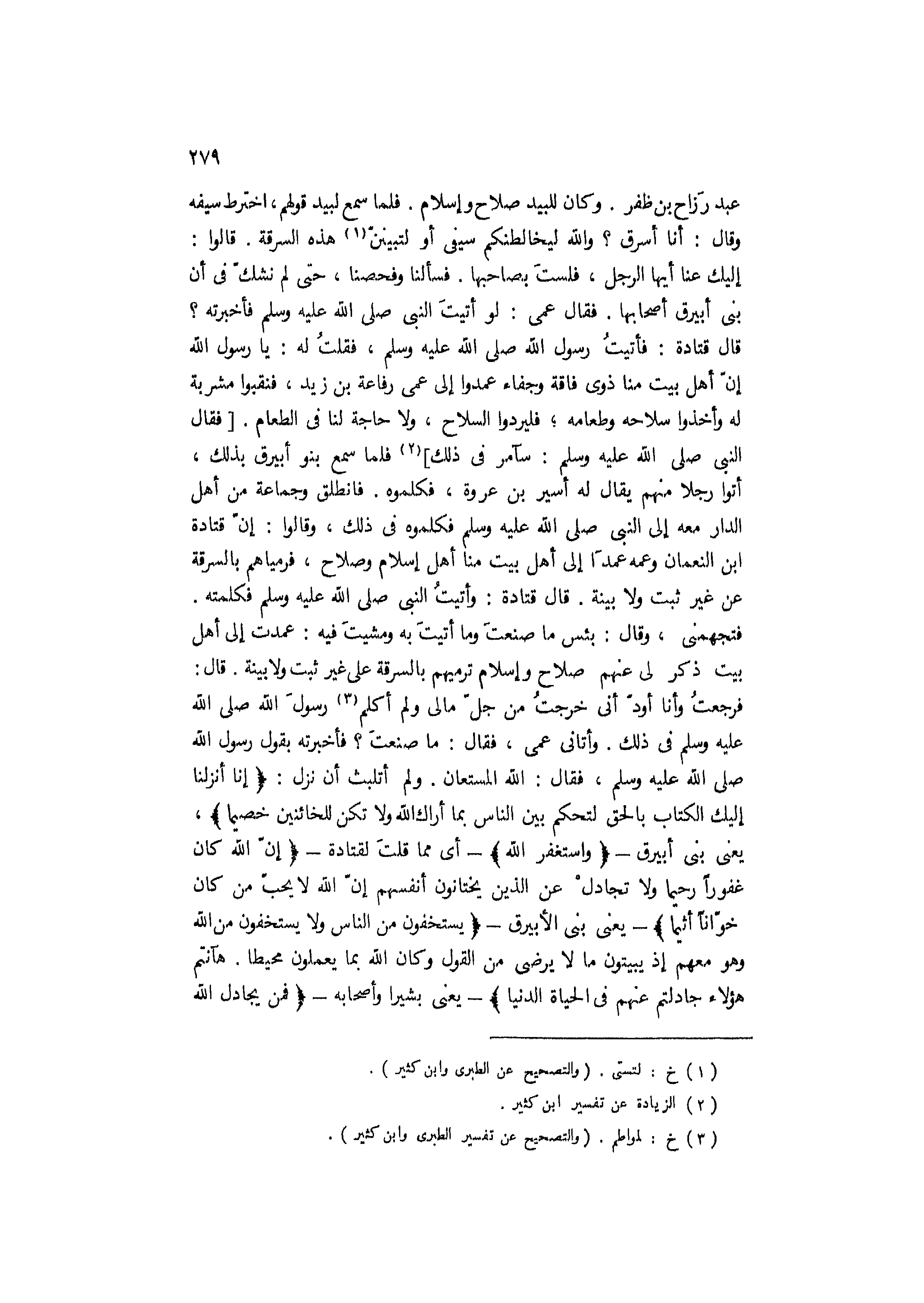 فرجعتُ وأنا أودّ أني خرجتُ من جلّ مالي ولم أكلم [3] رسول الله صلى الله عليه وسلم في ذَلِكَ. وأتاني عمي، فقال: ما صنعتَ؟ فأخبرته بِقَوْلِ رَسُول اللَّه صَلَّى اللَّهُ عَلَيْهِ وَسَلَّمَ، فَقَالَ: اللَّه المستعان. ولم أتلبث أن نزل: إِنَّا أَنْزَلْنا إِلَيْكَ الْكِتابَ بِالْحَقِّ لِتَحْكُمَ بَيْنَ النَّاسِ بِما أَراكَ اللَّهُ وَلا تَكُنْ لِلْخائِنِينَ خَصِيماً، يعنى بنى أبيرق- (وَاسْتَغْفِرِ اللَّهَ- أي مما قلتَ لقتادة- إِنَّ اللَّهَ كانَ غَفُوراً رَحِيماً وَلا تُجادِلْ عَنِ الَّذِينَ يَخْتانُونَ أَنْفُسَهُمْ إِنَّ اللَّهَ لا يُحِبُّ مَنْ كانَ خَوَّاناً أَثِيماً- يعني بني الأبيرق- يَسْتَخْفُونَ مِنَ النَّاسِ وَلا يَسْتَخْفُونَ مِنَ اللَّهِ وَهُوَ مَعَهُمْ إِذْ يُبَيِّتُونَ مَا لا يَرْضى مِنَ الْقَوْلِ وَكانَ اللَّهُ بِما يَعْمَلُونَ مُحِيطاً. ها أَنْتُمْ هؤُلاءِ جادَلْتُمْ عَنْهُمْ فِي الْحَياةِ الدُّنْيا