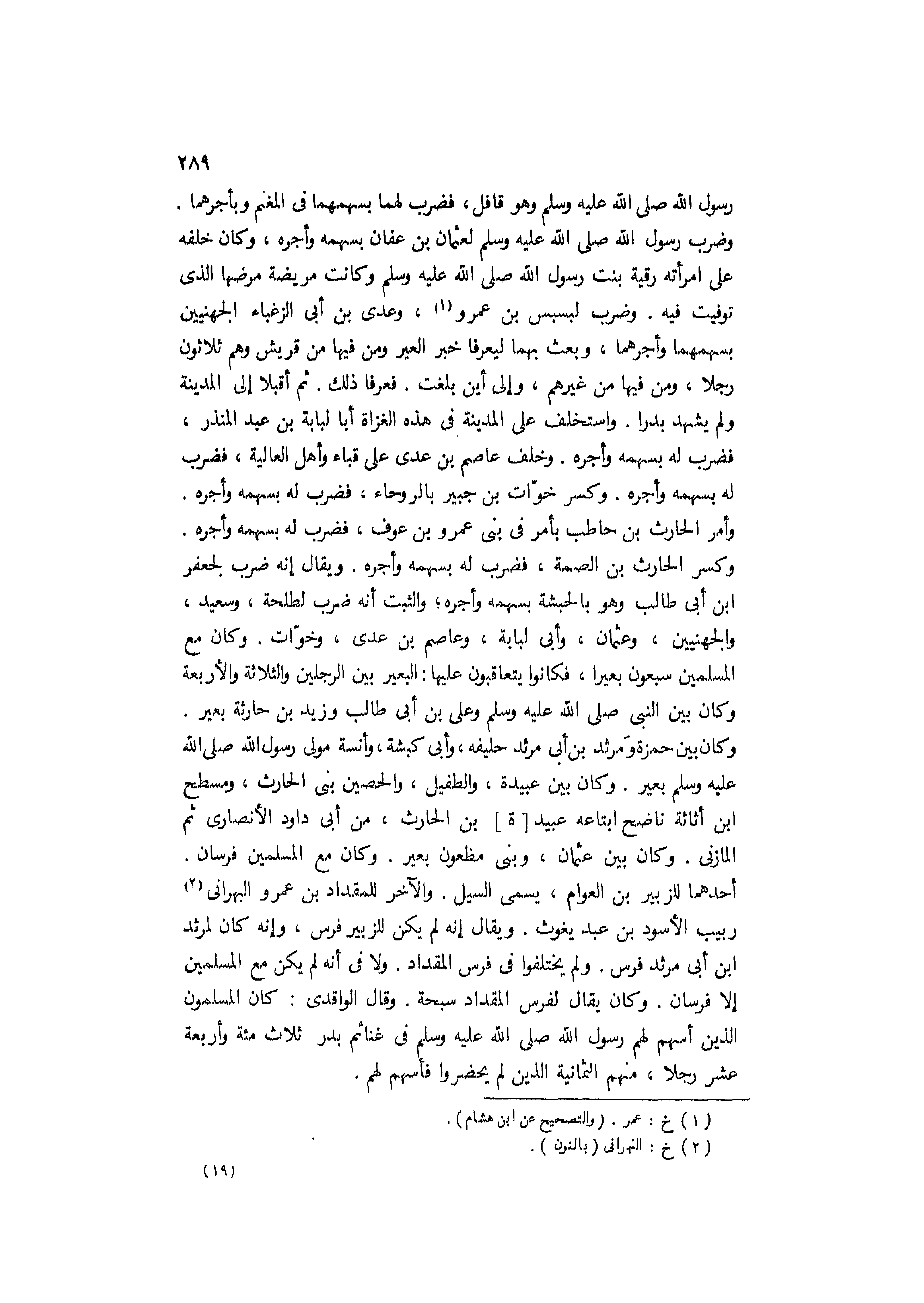 وضرب رَسُول اللَّه صَلَّى اللَّهُ عَلَيْهِ وَسَلَّمَ لعثمان بْن عفان بسهمه وأجره، وكان خلفه عَلَى امرأته رقية بِنْت رَسُول اللَّه صَلَّى اللَّهُ عَلَيْهِ وَسَلَّمَ وكانت مريضة مرضها الَّذِي توفيت فِيهِ. وضرب لبَسْبَس بْن عَمْرو [1] ، وعدي بْن أَبِي الزغباء الجهنيين بسهمهما وأجرهما، وبعث بهما ليعرفا خبر العير ومن فيها من قريش وهم ثلاثون رجلًا، ومن فيها من غيرهم، وإلى أَيْنَ بلغت. فعرفا ذَلِكَ. ثُمَّ أقبلا إلى المدينة ولم يشهد بدرًا. واستخلف عَلَى المدينة فِي هَذِهِ الغزاة أبا لبابة بْن عَبْد المنذر، فضرب لَهُ بسهمه وأجره. وخلف عاصم بْن عدي عَلَى قباء وأهل العالية، فضرب لَهُ بسهمه وأجره. وكسر خوّات بْن جُبَيْر بالروحاء، فضرب لَهُ بسهمه وأجره.