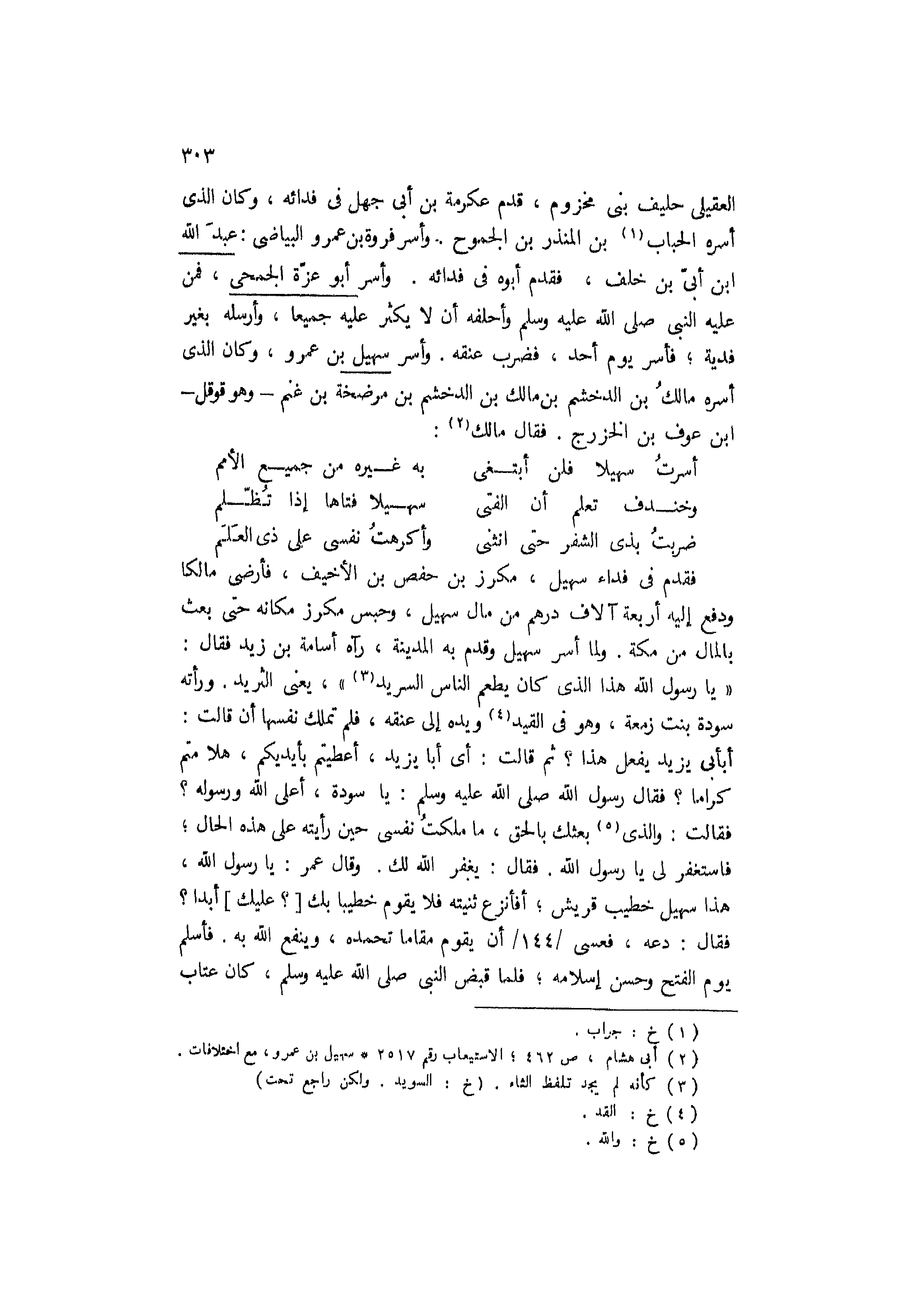العقيلي حليف بني مخزوم، قدم عكرمة بْن أَبِي جهل فِي فدائه، وكان الَّذِي أسره الْحُبَاب [1] بْن المنذر بْن الجموح. وأسر فروة بن عمرو البياضي: عبد الله ابن أَبِي بْن خلف، فقدم أَبُوهُ فِي فدائه. وأسر أَبُو عزَّة الجمحي، فمن عَلَيْهِ النَّبِيّ صَلَّى اللَّهُ عَلَيْهِ وَسَلَّمَ وأحلفه أن لا يكثر عليه جميعا، وأرسله بغير فدية، فأسر يَوْم أحد، فضرب عنقه. وأسر سهيل بْن عَمْرو، وكان الَّذِي أسره مالكُ بْن الدخشم بْن مالك بْن الدخشم بْن مرضخة بْن غنم- وهو قوقل- ابن عوف بْن الخزرج. فَقَالَ مالك [2] :