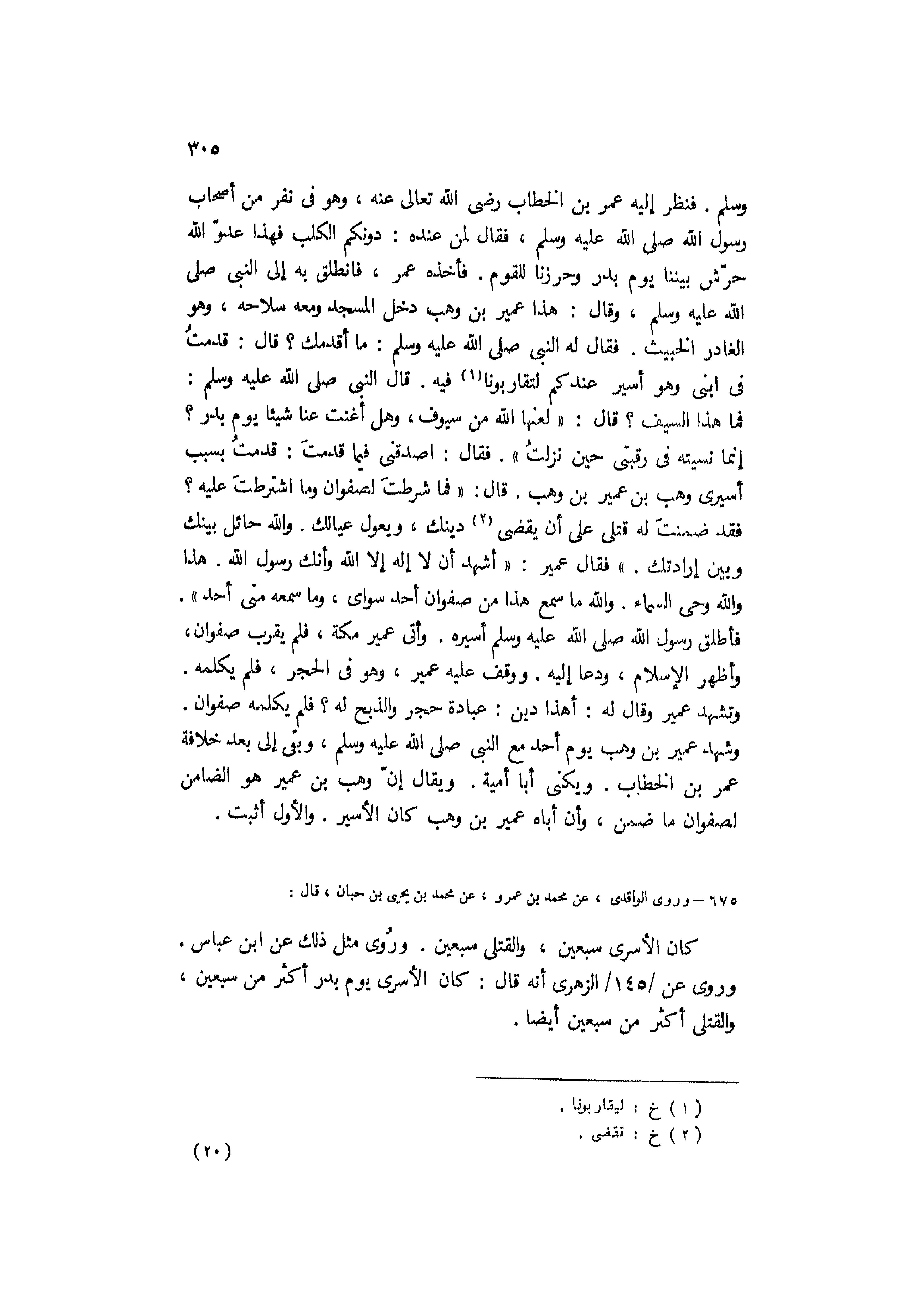 وَسَلَّمَ. فنظر إِلَيْه عُمَر بْن الخطاب رَضِي اللَّه تَعَالى عَنْهُ، وهو فِي نَفَرٌ مِنْ أَصْحَابِ رَسُولِ اللَّهِ صَلَّى اللَّهُ عَلَيْهِ وسلم، فَقَالَ لمن عنده: دونكم الكلب فهذا عدوّ الله حرّش بيننا يوم بدر وحرزنا للقوم. فأخذه عُمَر، فانطلق بِهِ إِلَى النَّبِيّ صَلَّى اللَّهُ عَلَيْهِ وَسَلَّمَ، وقَالَ: هَذَا عمير بْن وهب دخل المسجد ومعه سلاحه، وهو الغادر الخبيث. فَقَالَ لَهُ النَّبِيّ صَلَّى اللَّهُ عَلَيْهِ وَسَلَّمَ: ما أقدمك؟ قَالَ: قدمتُ فِي ابنى وهو أسير عندكم لتقاربونا [1] فِيهِ. قَالَ النَّبِيّ صَلَّى اللَّهُ عَلَيْهِ وَسَلَّمَ: