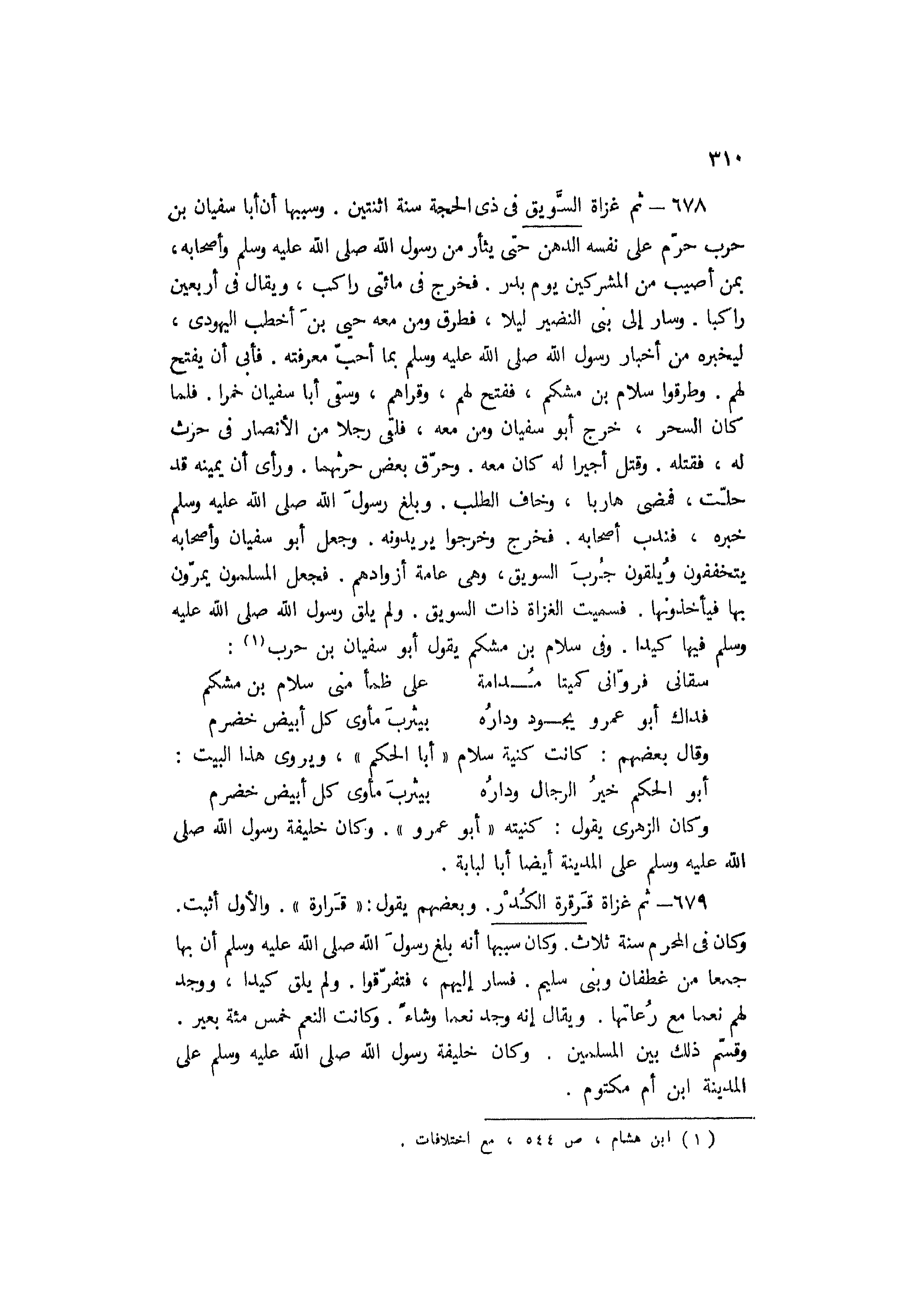 فِي ذي الحجة سنة اثنتين. وسببها أن أبا سُفْيَان بْن حرب حرّم عَلَى نفسه الدهن حتَّى يثأر من رَسُول اللَّهِ صَلَّى اللَّهُ عَلَيْهِ وَسَلَّمَ وأصحابه، بمن أصيب من المشركين يَوْم بدر. فخرج فِي مائتي راكب، وَيُقَالُ فِي أربعين راكبًا. وسار إلى بني النضير ليلًا، فطرق ومن معه حيي بنَ أخطب اليهودي، ليخبره من أخبار رَسُولَ اللَّه صَلَّى اللَّهُ عَلَيْهِ وَسَلَّمَ بِمَا أحبّ معرفته. فأبي أن يفتح لهم. وطرقوا سلام بْن مِشْكَم، ففتح لهم، وقراهم، وسقى أبا سُفْيَان خمرًا. فلما كَانَ السحر، خرج أبو سُفْيَان ومن معه، فلقي رجلًا من الأنصار فِي حرث لَهُ، فقتله. وقتل أجيرًا لَهُ كَانَ معه. وحرّق بعض حرثهما. ورأى أن يمينه قَدْ حلّت، فمضى هاربًا، وخاف الطلب. وبلغ رسولَ اللَّه صَلَّى اللَّهُ عَلَيْهِ وَسَلَّمَ خبره، فندب أصحابه. فخرج وخرجوا يريدونه. وجعل أَبُو سُفْيَان وأصحابه يتخففون ويُلقون جُربَ السويق، وهي عامة أزوادهم. فجعل المسلمون يمّرون بها فيأخذونها. فسميت الغزاة ذات السويق. ولم يلق رَسُول اللَّه صَلَّى اللَّهُ عَلَيْهِ وَسَلَّمَ فيها كيدًا. وفي سلام بْن مشكم يَقُولُ أَبُو سُفْيَان بْن حرب [1] :